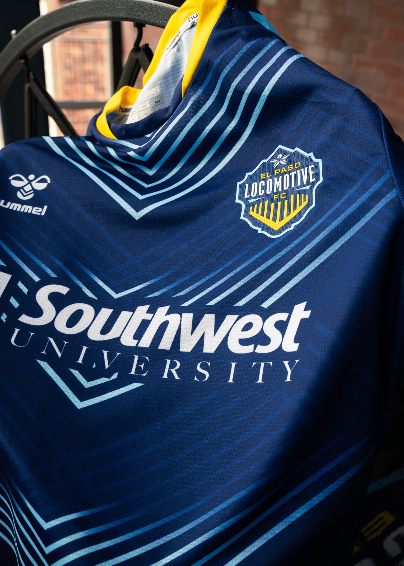 Dressed in navy, the kit boasts West Texas Sky Blue cowcatchers down the middle, complemented by subtler cowcatchers that intersect upwards towards a High Noon Yellow collar. The front of the kit proudly displays the Locomotive and hummel logos, with Southwest University featured prominently in the centre.