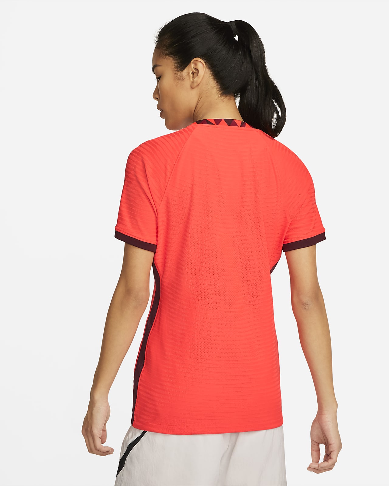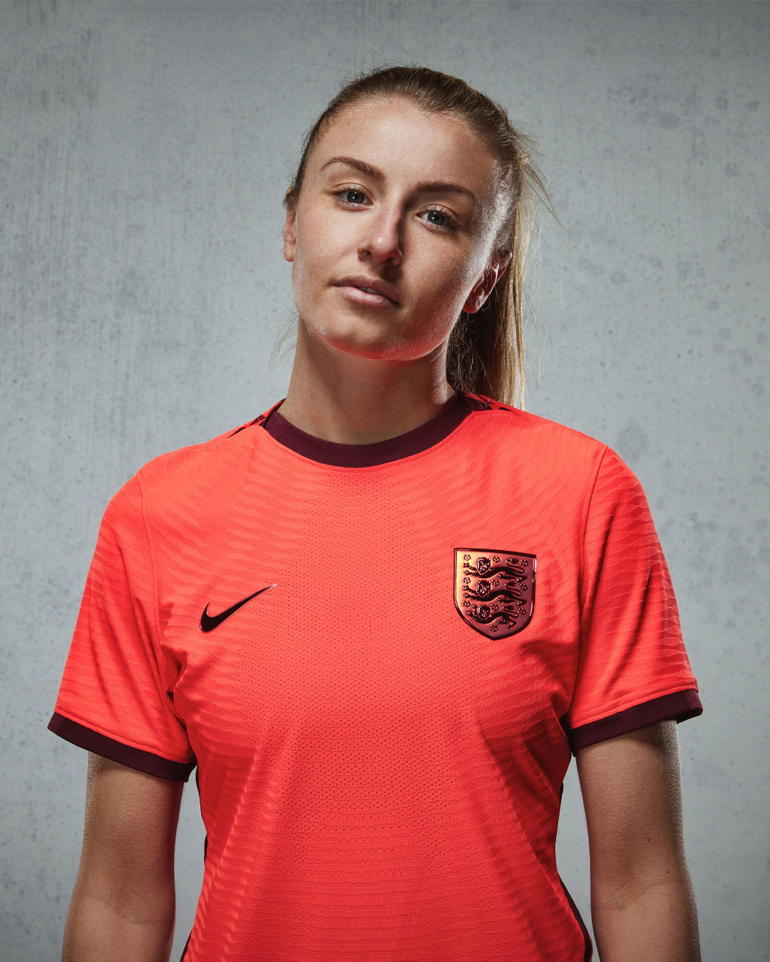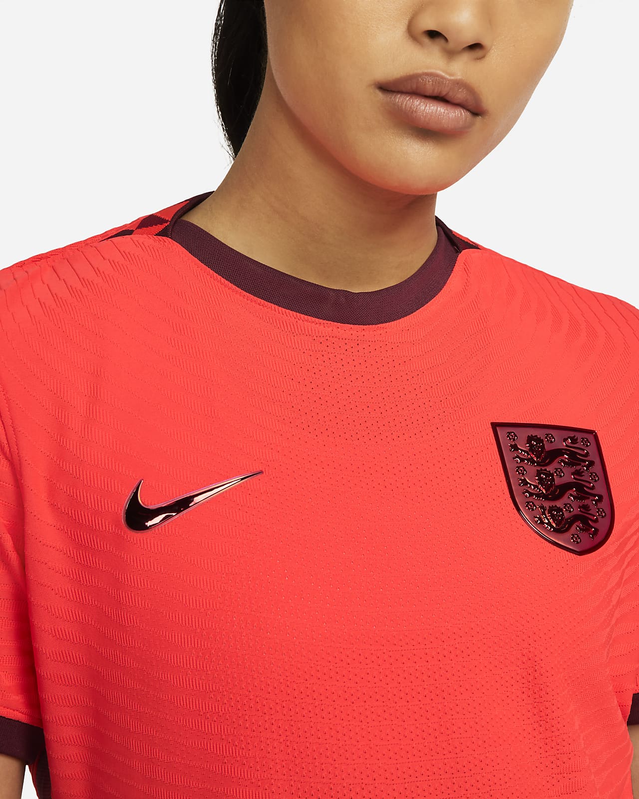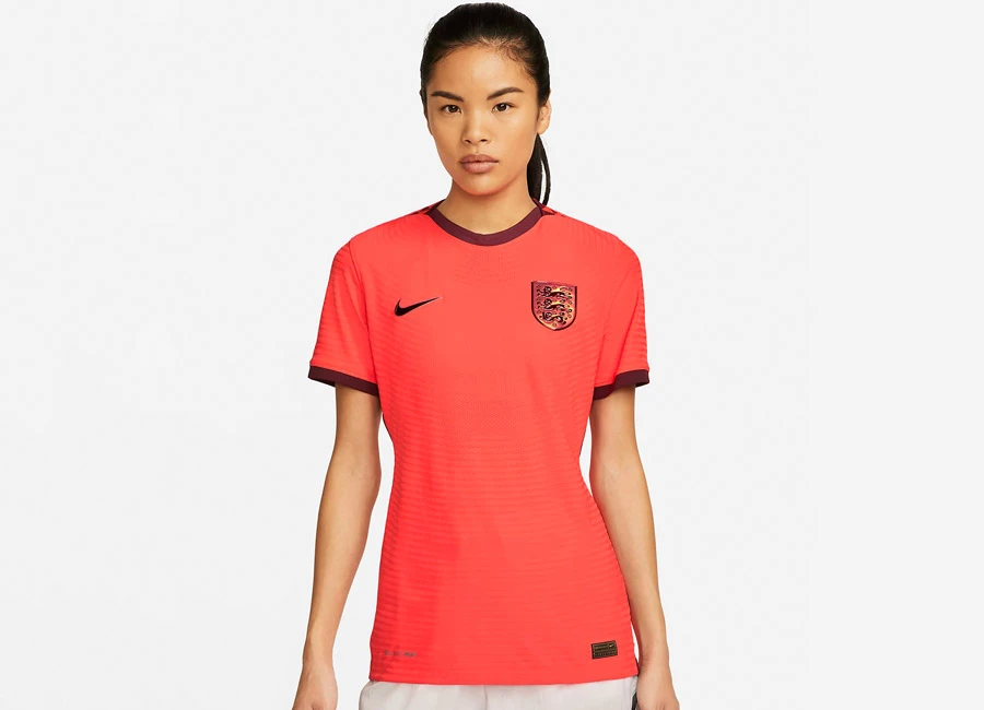 The “Bright Crimson” and “Deep Maroon” colouring is a departure from the traditional, while the neck replicates the “cut diamond” styling of the primary design and the iridescent crest and Swoosh for the Lionesses’ change release are also consistent.
