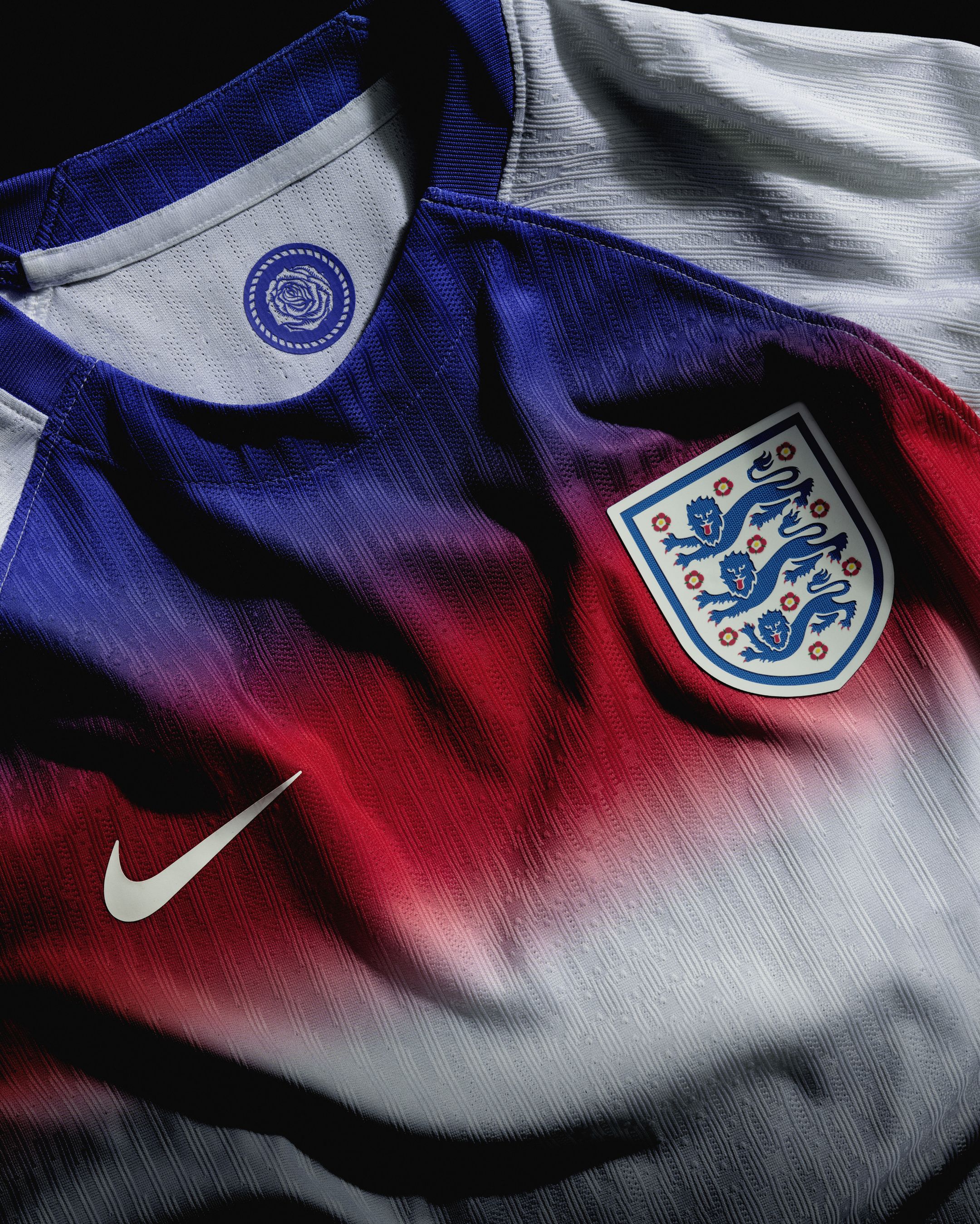 The base is white, with a prominent fade of red and blue across the chest, inspired by past kits from the 1970s and 1980s. The England crest sits on the left chest, while the number set includes a thorn detail as a subtle nod to the national symbol. Inside the collar, an “inner pride” mark features the English rose.