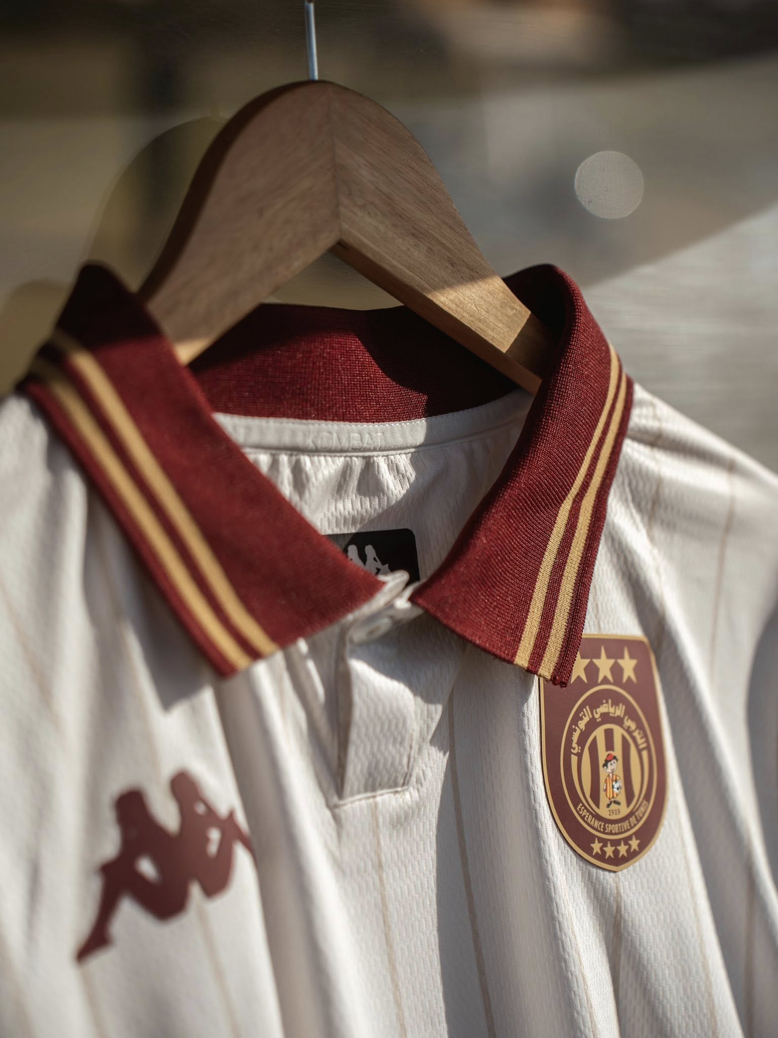 The ES Tunis crest appears in a special monochrome execution, framed within a shield and topped with three stars, while Kappa’s Omini logo is applied to the chest and sleeves in a matching burgundy tone.