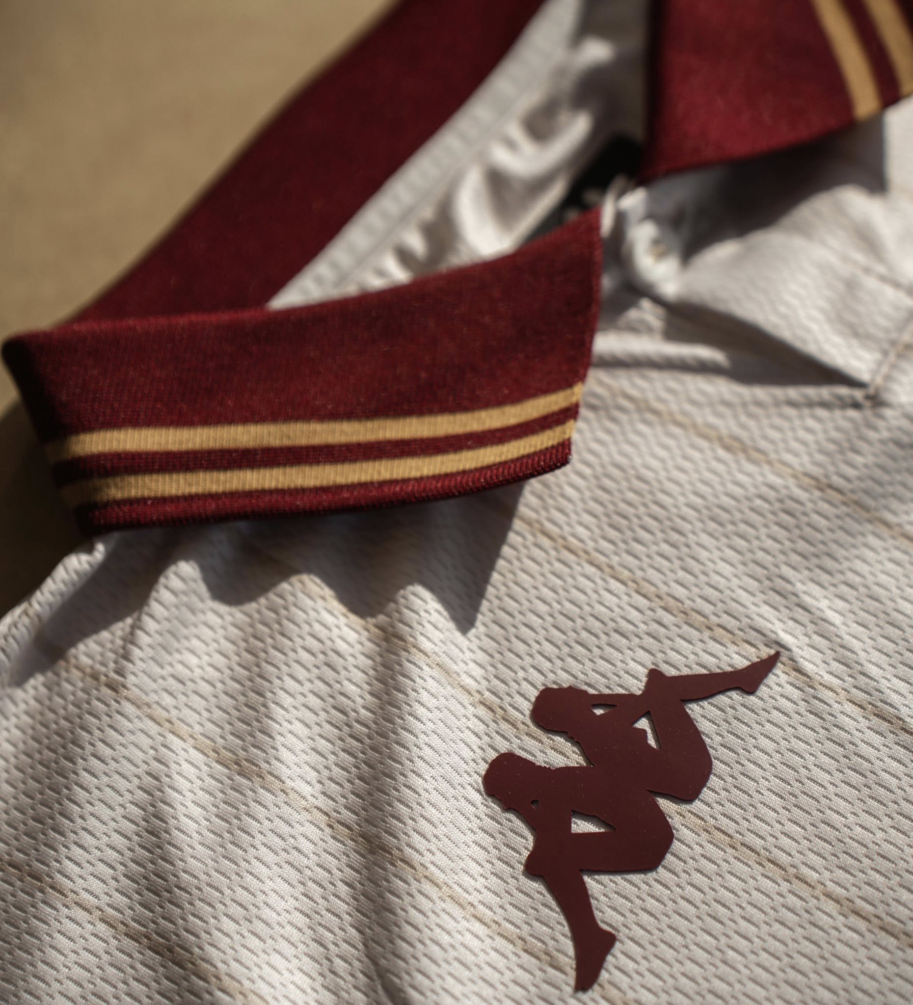 The ES Tunis jersey has a white base with fine vertical pinstripes running through the body of the shirt. A traditional polo collar is applied, finished in deep burgundy with gold stripe detailing, which is mirrored on the sleeve cuffs.