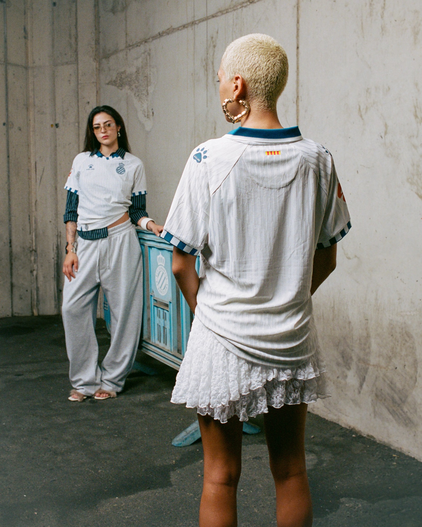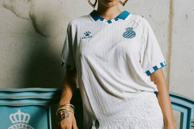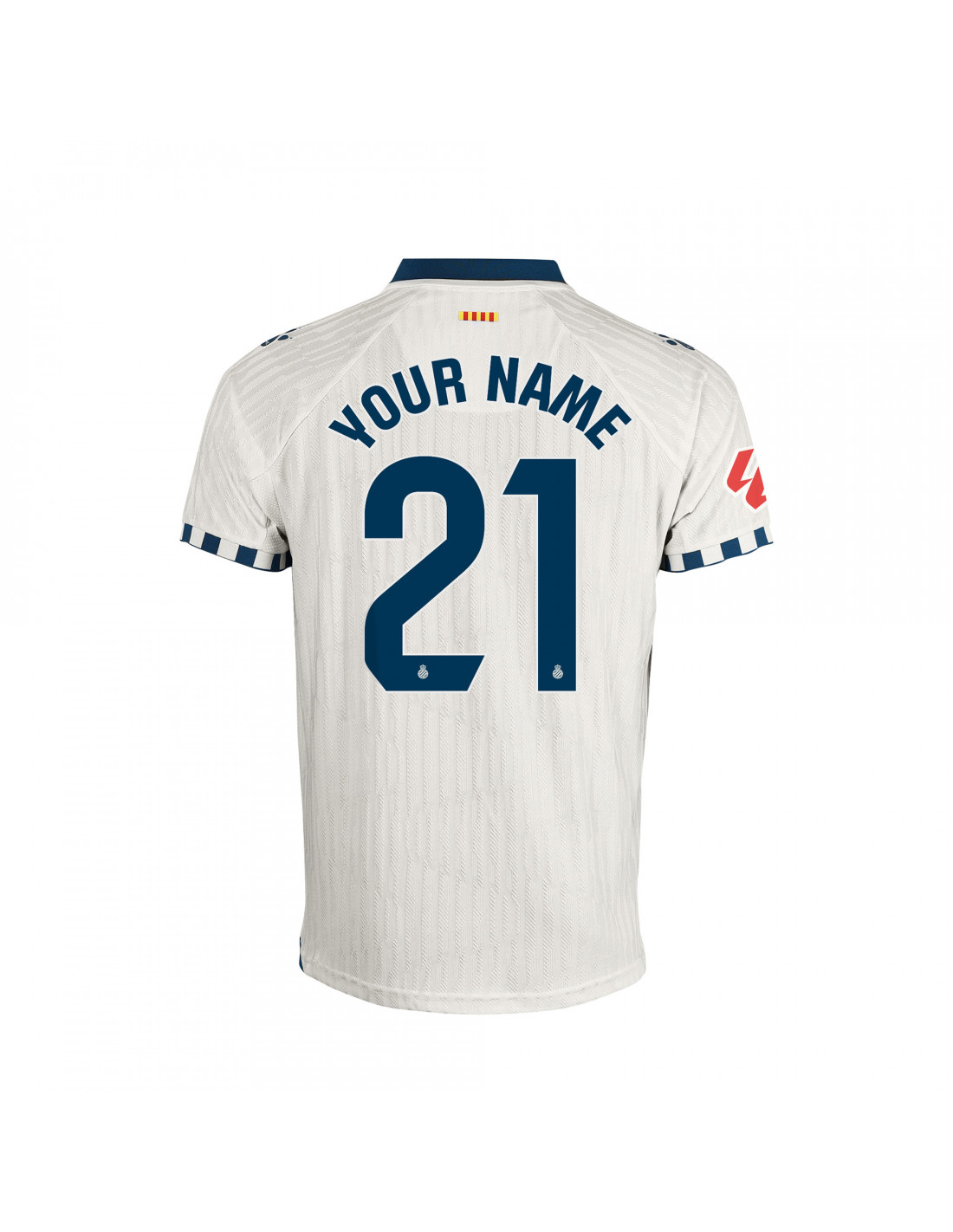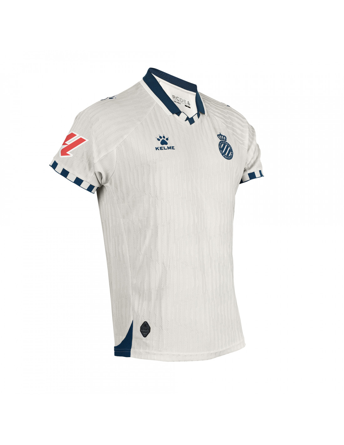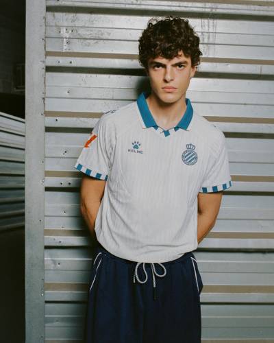 RCD Espanyol have revealed their 25/26 Away kit by Kelme, featuring a light beige base with navy blue accents.