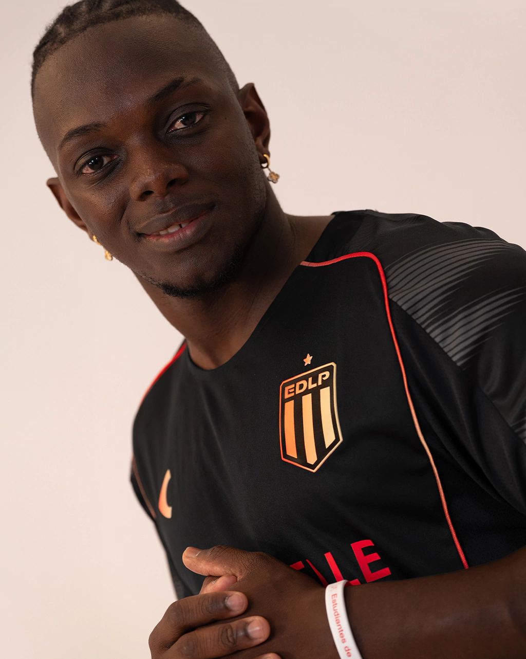 The new Estudiantes shirt is paired with matching black shorts and socks, both featuring red accent elements, to form the full third strip for the 2026 AFA Liga Profesional de Fútbol campaign in Argentina.