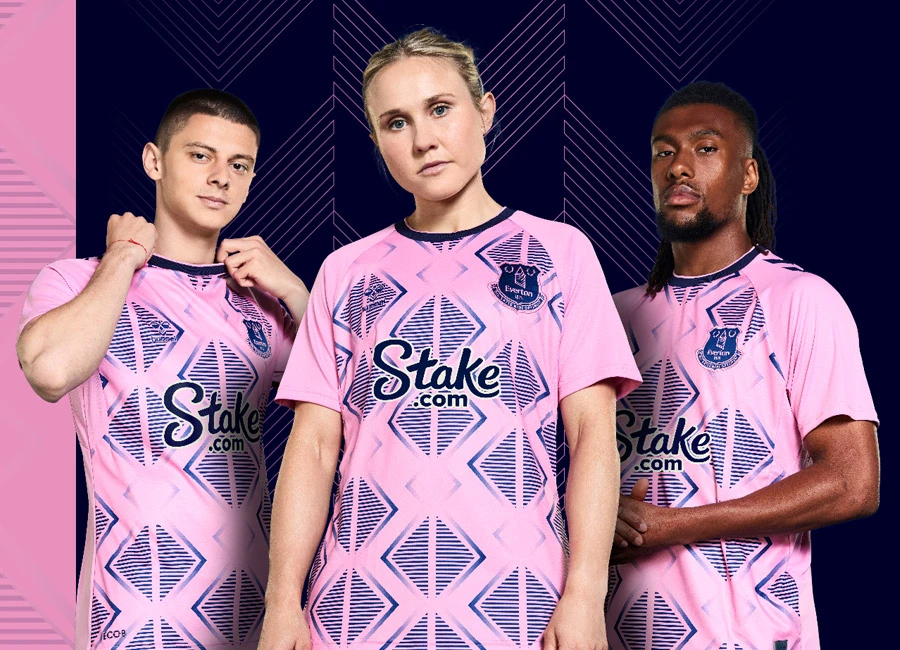 The away shirt, in an eye-catching rosebloom pink, features a distinctive, patriot blue pattern inspired by the angled roof of the tower in the Club crest - and amplified into a geometric print for 2022.