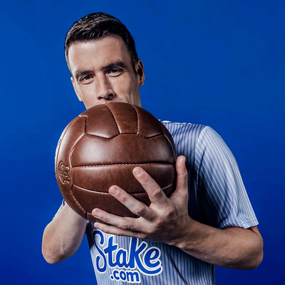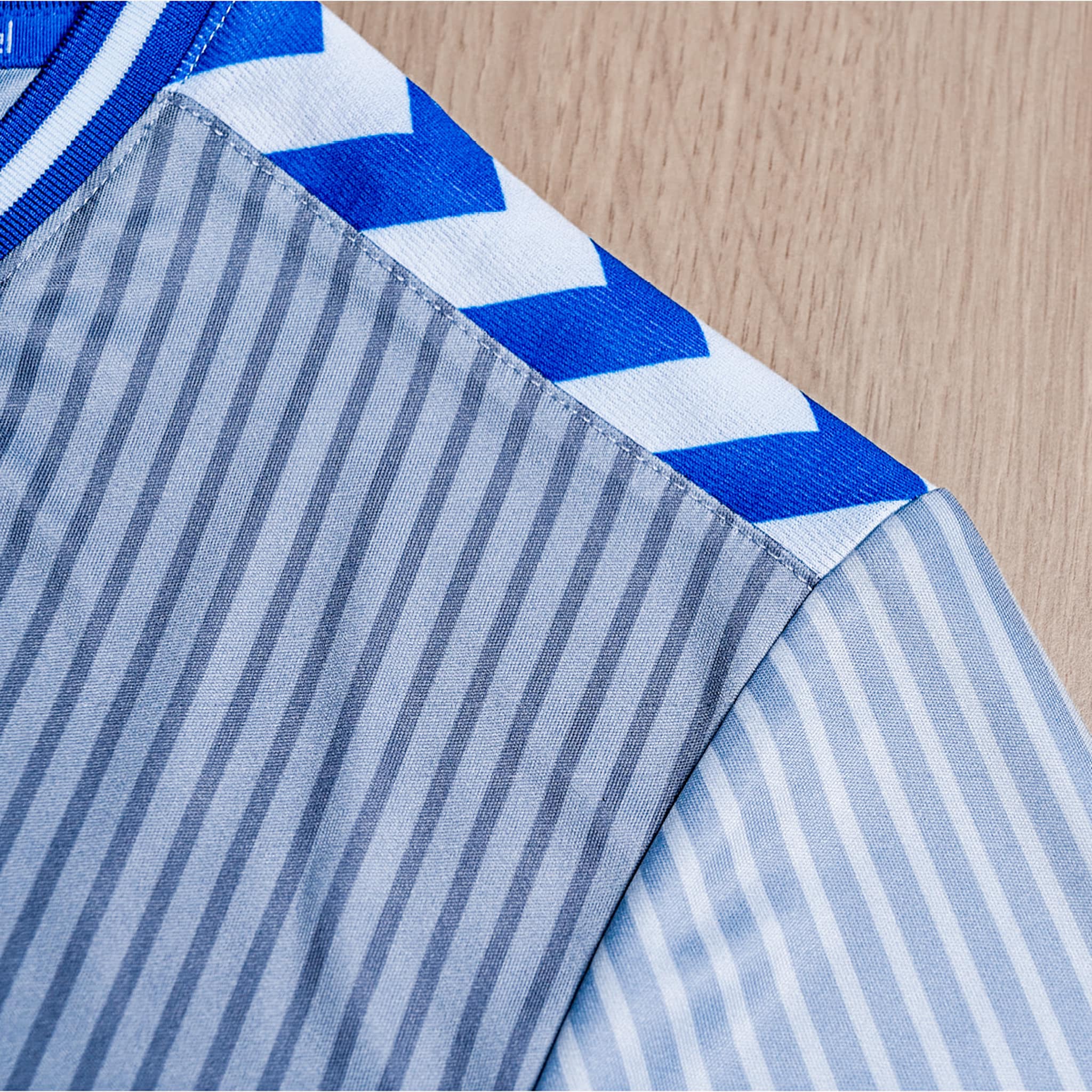 Drawing from hummel's iconic design, Everton's grey, blue, and white kit pays homage to the 'half-and-half' shirt worn by the Denmark national team during the 1986 World Cup.