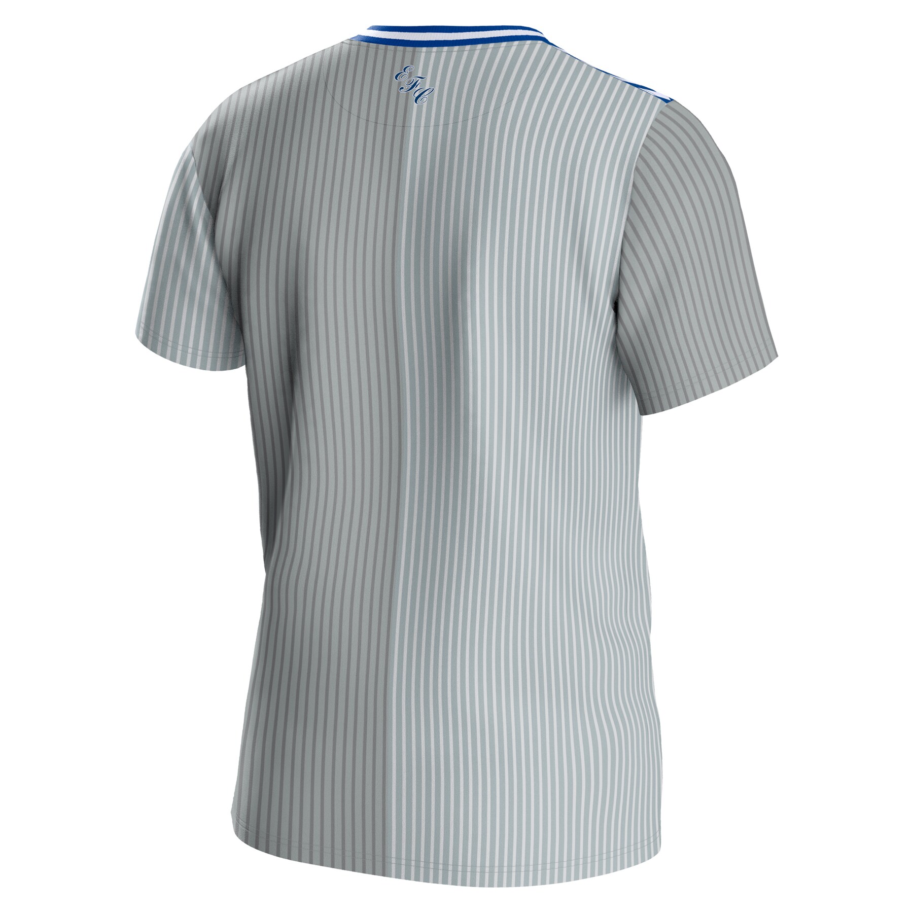 This marks Everton's return to a grey strip for the first time since 2017/18, featuring pinstripes that contrast ultimate and neutral grey tones against a white base and the classic Everton blue.