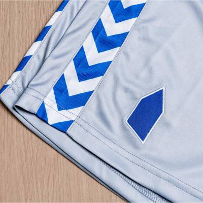 Completing the look are ultimate grey shorts with vertical blue and white chevrons, and ultimate grey socks featuring a blue, horizontal chevron trim.