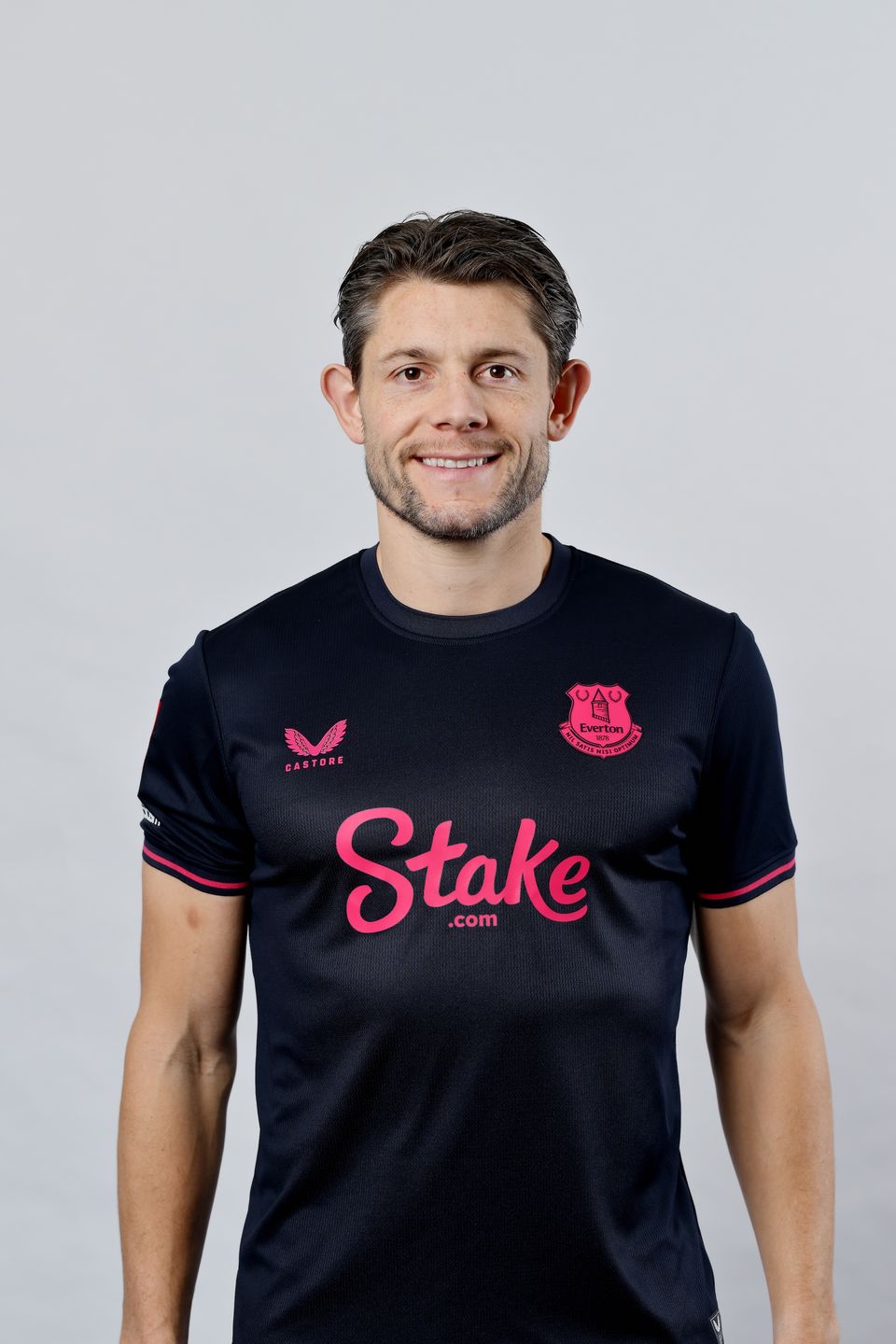 The Everton football shirt is presented in a deep navy base, combined with high contrast pink detailing across the club crest, Castore branding and Stake shirt sponsor. The Everton crest appears in a tonal pink application on the chest, retaining the club motto Nil Satis Nisi Optimum within the shield. Subtle pink trim is also applied to the sleeve cuffs, creating a consistent visual identity across the kit.