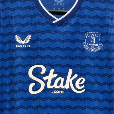 The royal blue shirt features an all-over wave pattern and an overlapping V-neck collar with white trim, with the Castore logo and Everton crest on the chest and the Stake sponsor across the front.