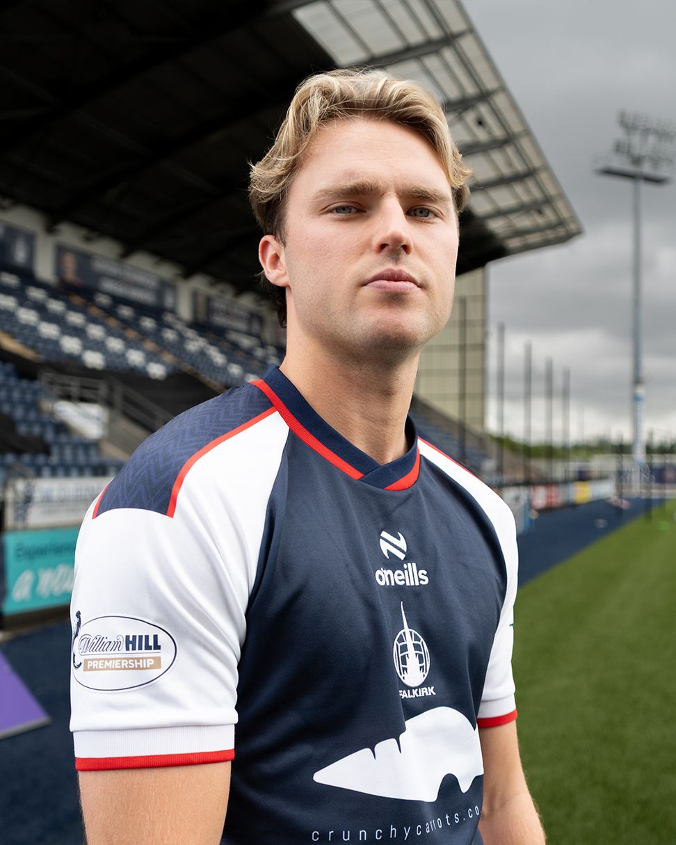 A centralised Falkirk crest appears below the O'Neills logo, while shirt sponsor Crunchy Carrots returns for a third consecutive year. The kit continues the traditional navy, white and red palette, completed by white shorts with navy and red detailing, and red socks with white and navy trim.