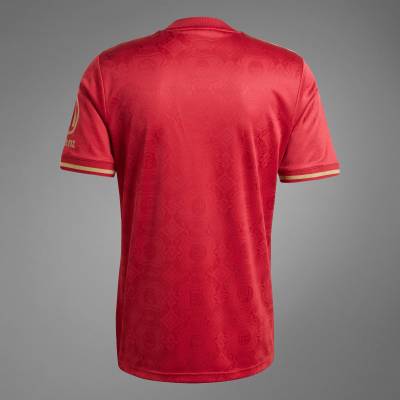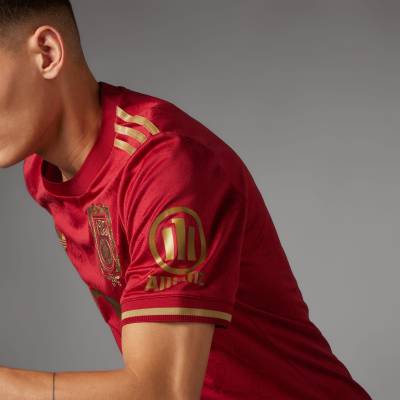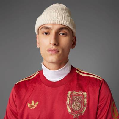 The design pays tribute to Bayern’s historic home grounds—the Grünwalder Stadion, Olympiastadion, and Allianz Arena—reflecting the club’s rich heritage and identity. The kit, in classic red with gold accents, includes an anniversary crest inspired by Bayern’s founding document, coat of arms, and Bavarian laurel wreath. The Trefoil adidas Originals logo also appears, connecting past and present.