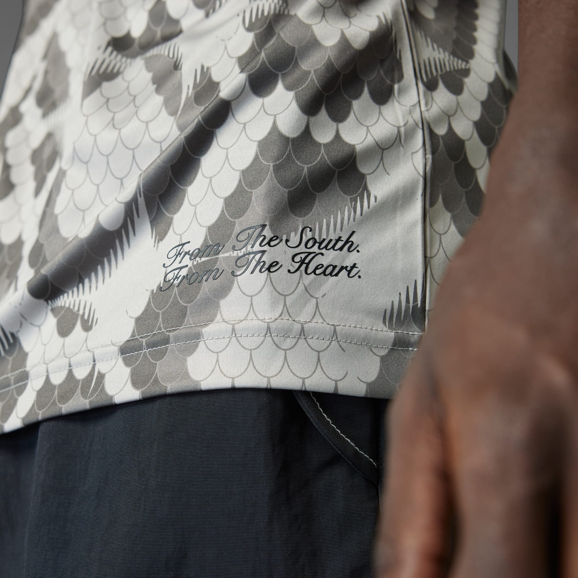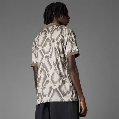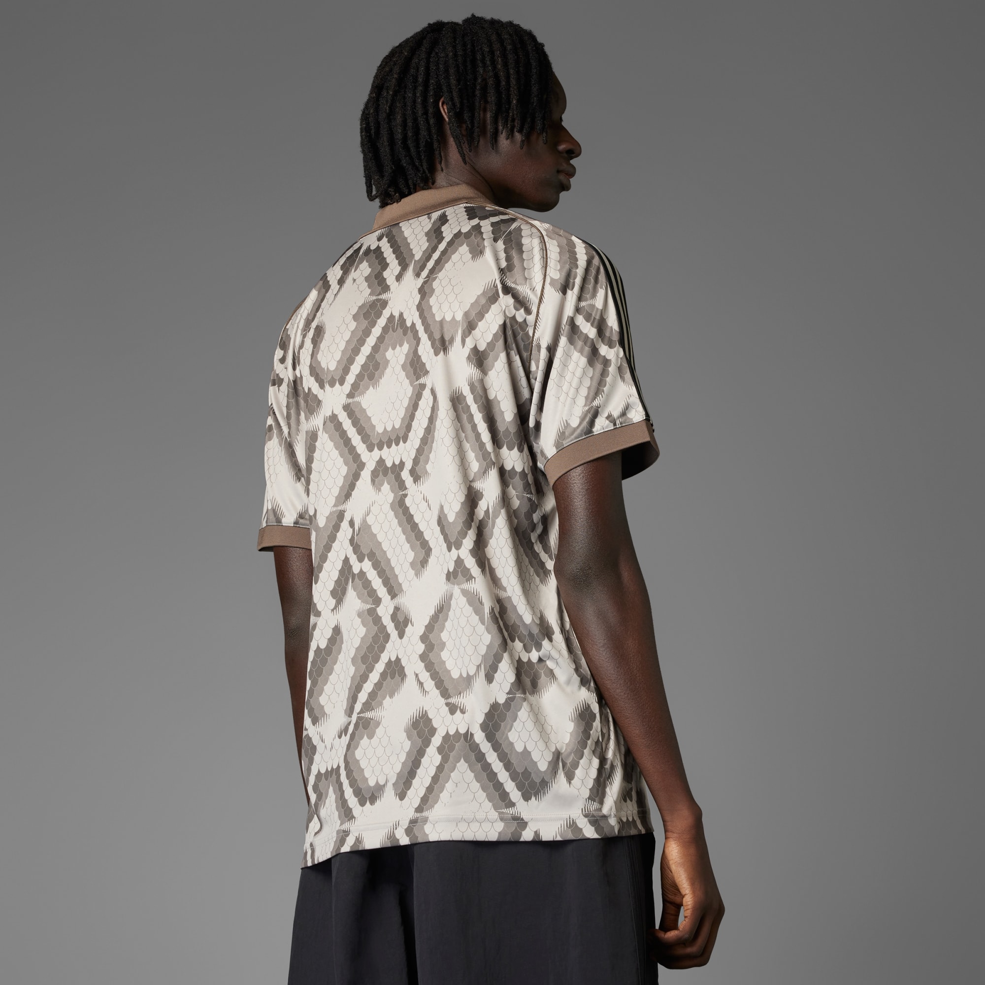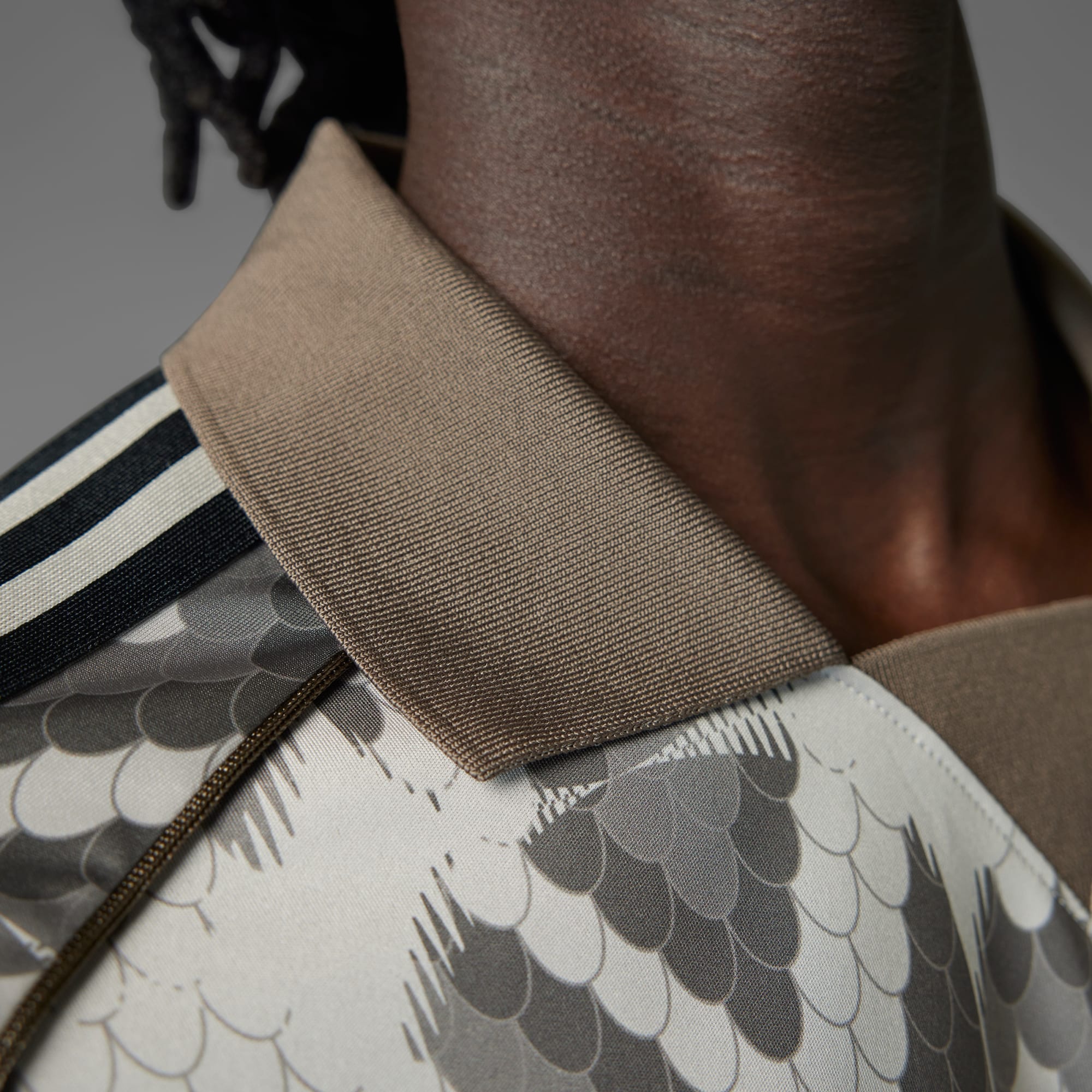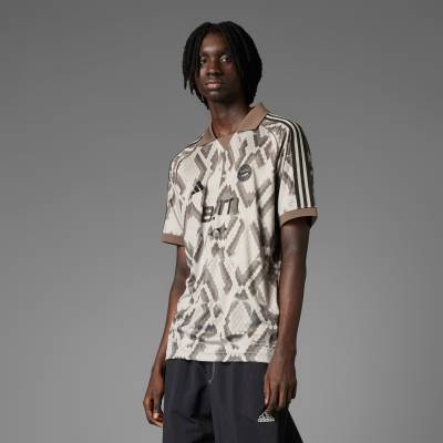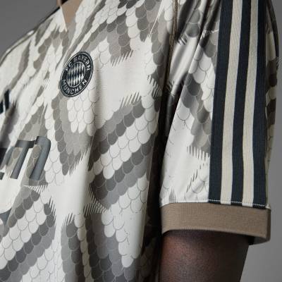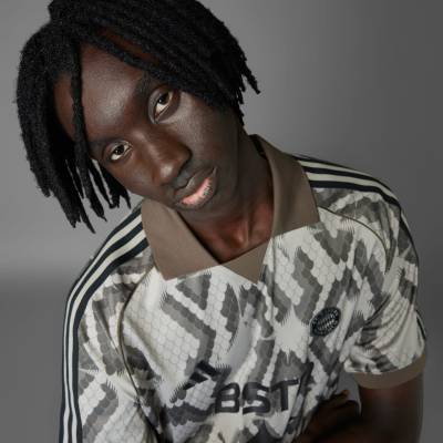Part of the collection is this FC Bayern BSTN jersey, featuring a full-body snakeskin pattern in shades of beige and taupe, reflecting BSTN’s signature aesthetic. The design includes Dark Grey adidas stripes on the shoulders, a Light Brown collar, and sleeve cuffs that complement the muted colour palette.