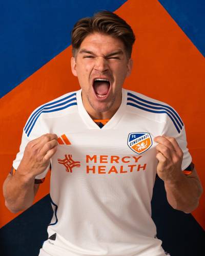This will be FC Cincinnati's first predominantly white kit since 2021, featuring the club crest on the left hem, the adidas logo on the right, and the main sponsor, Mercy Health, displayed in orange at the center. Adidas' signature 3-Stripes in blue with orange outlines adorn the shoulders.