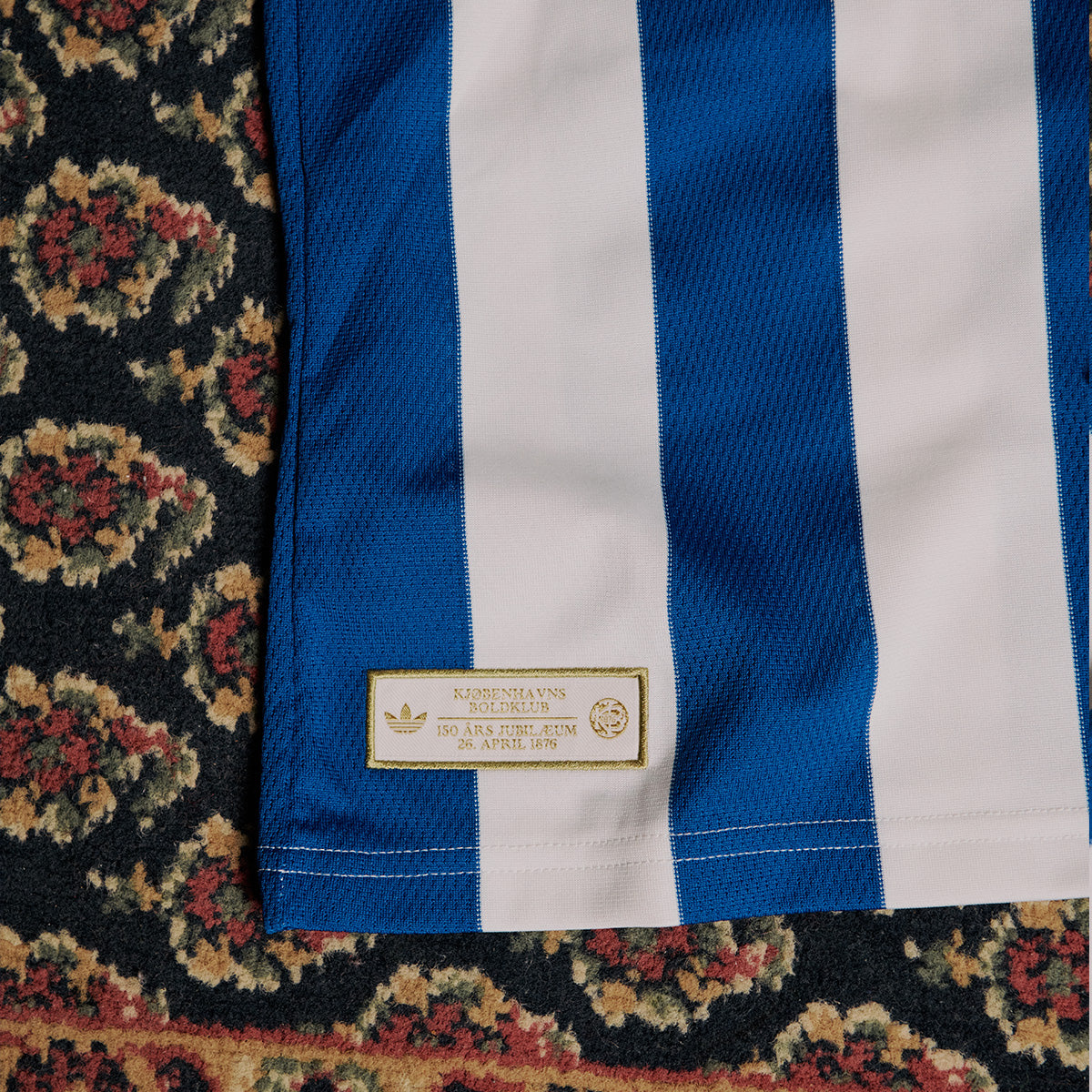 Additional detailing reinforces the heritage focus of this FC Copenhagen 150th anniversary kit. A stitched label near the hem reads “Kjøbenhavns Boldklub 150 års jubilæum 26 April 1876”, referencing the club’s founding date. The overall construction uses modern performance fabric, combining a traditional aesthetic with contemporary manufacturing standards.