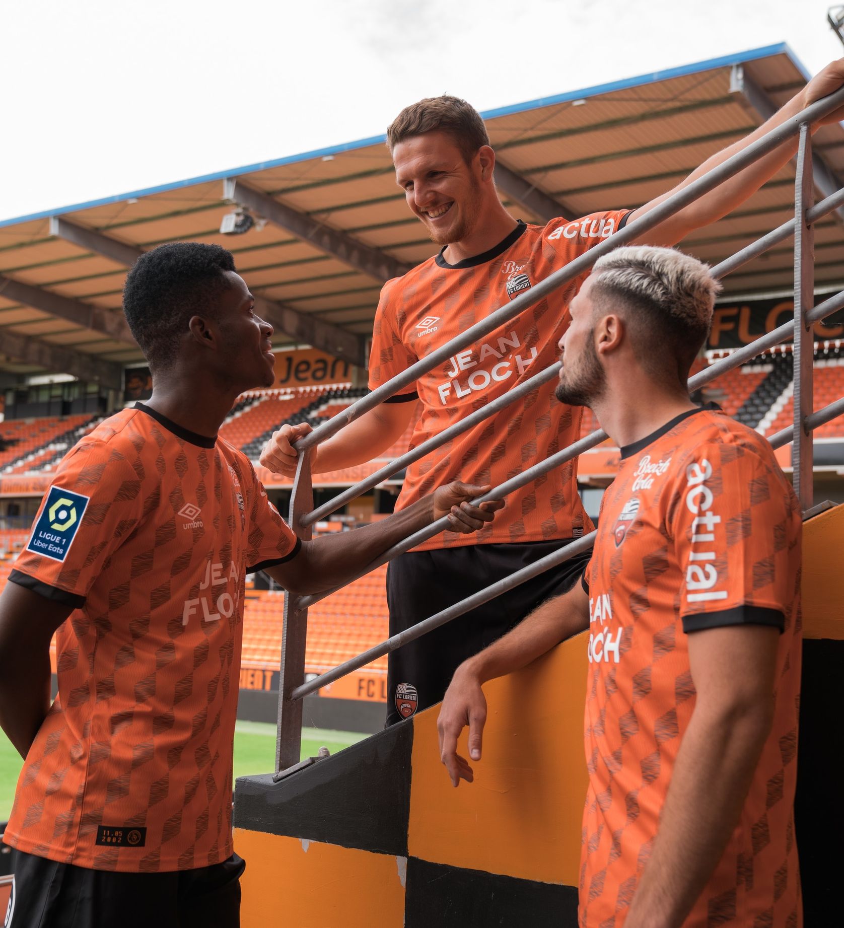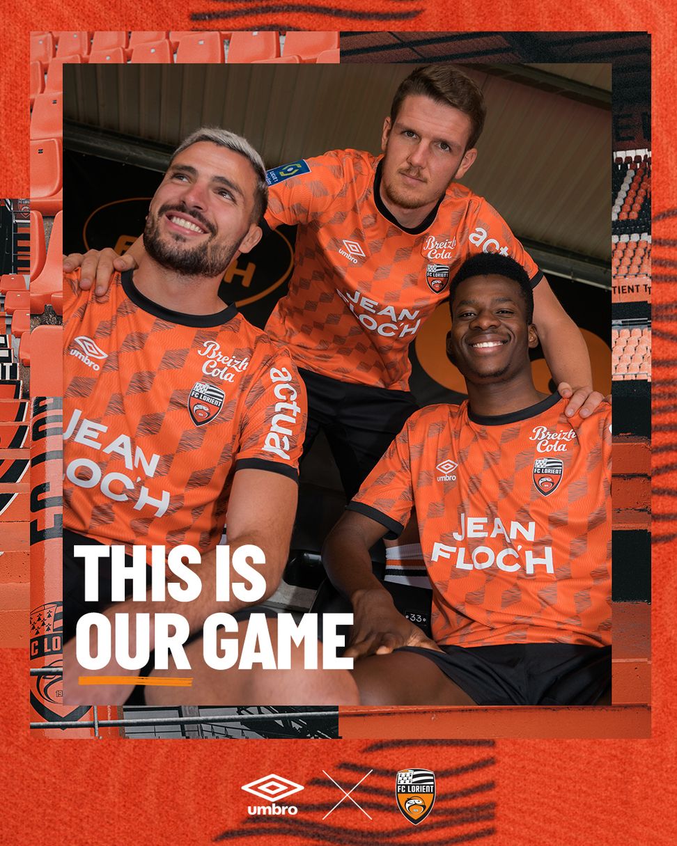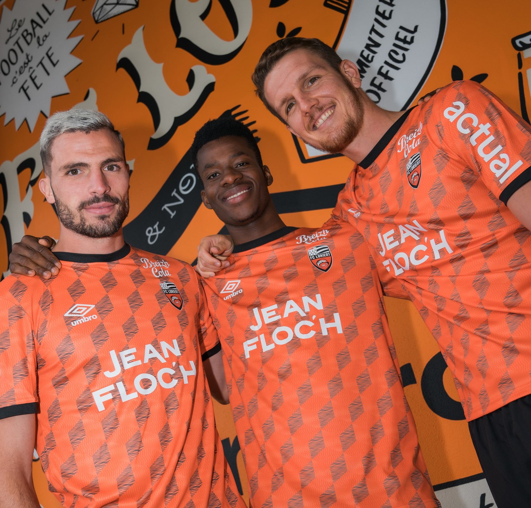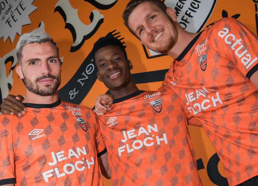 Produced by British brand Umbro, the 2022-23 primary release for the Breton side is in orange with a diagonal diamond pattern in a black, wave fill.