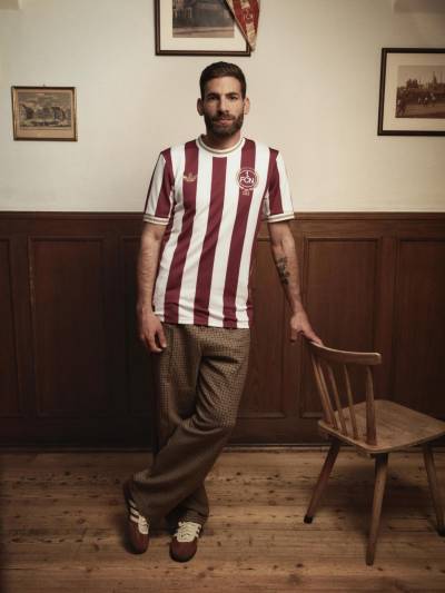 The shirt features red and white vertical stripes, a nod to the club’s founding colours, and includes gold detailing on the collar and sleeve cuffs.