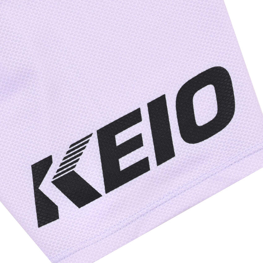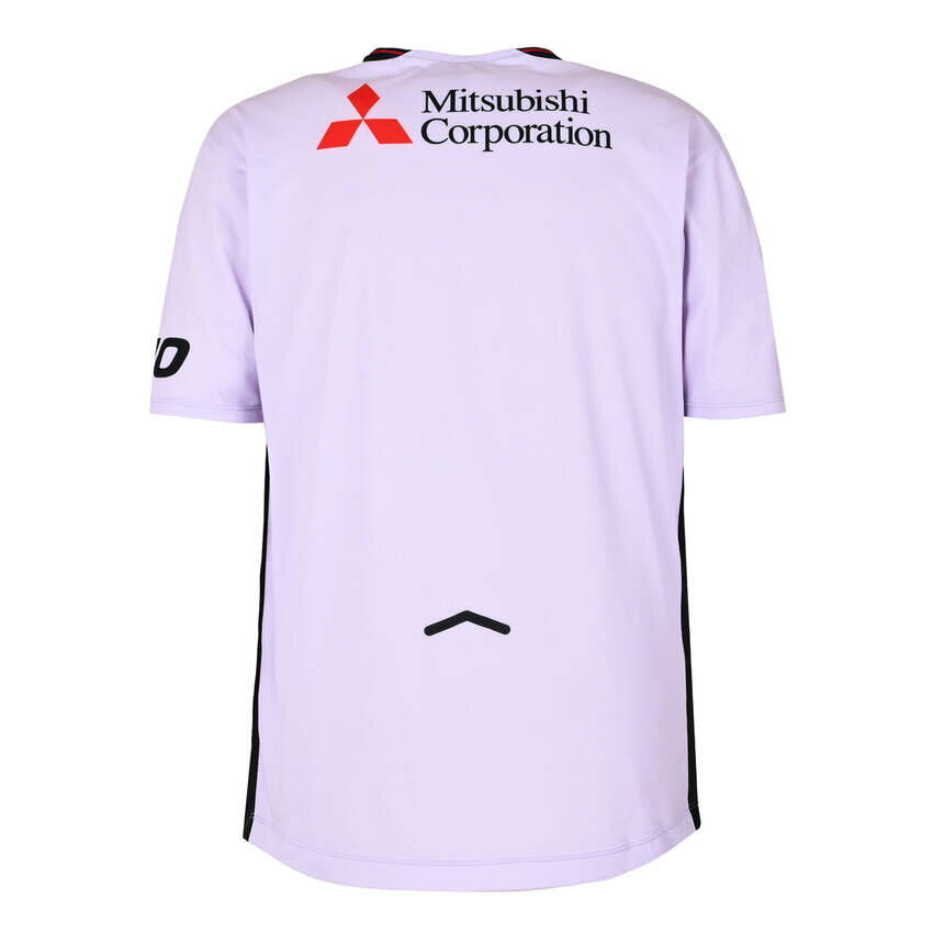 The secondary FC Tokyo football shirt is presented in a lilac colour and is designed around the theme of lightning. The visual concept reflects the image of a player sprinting across the pitch with decisive speed, expressed through navy streak style markings across the front and shoulders. The club crest sits on the right chest, with sponsor applications from Tokyo Gas, Mixi, Mitsui and Keio surrounding it. A New Balance logo appears on the opposite side, and Mitsubishi Corporation branding is positioned on the upper back. A small arrow mark features low on the rear panel.