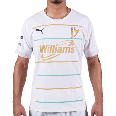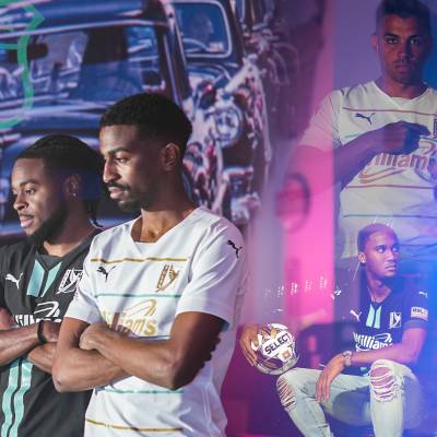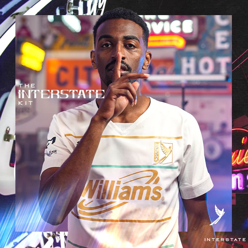 The crest and “Williams” sponsorship logo are in gold too, with a green “Greenwood Ave” logo on the upper back of a shirt that celebrates the grid of the interstate system and will form a kit with white shorts and socks.