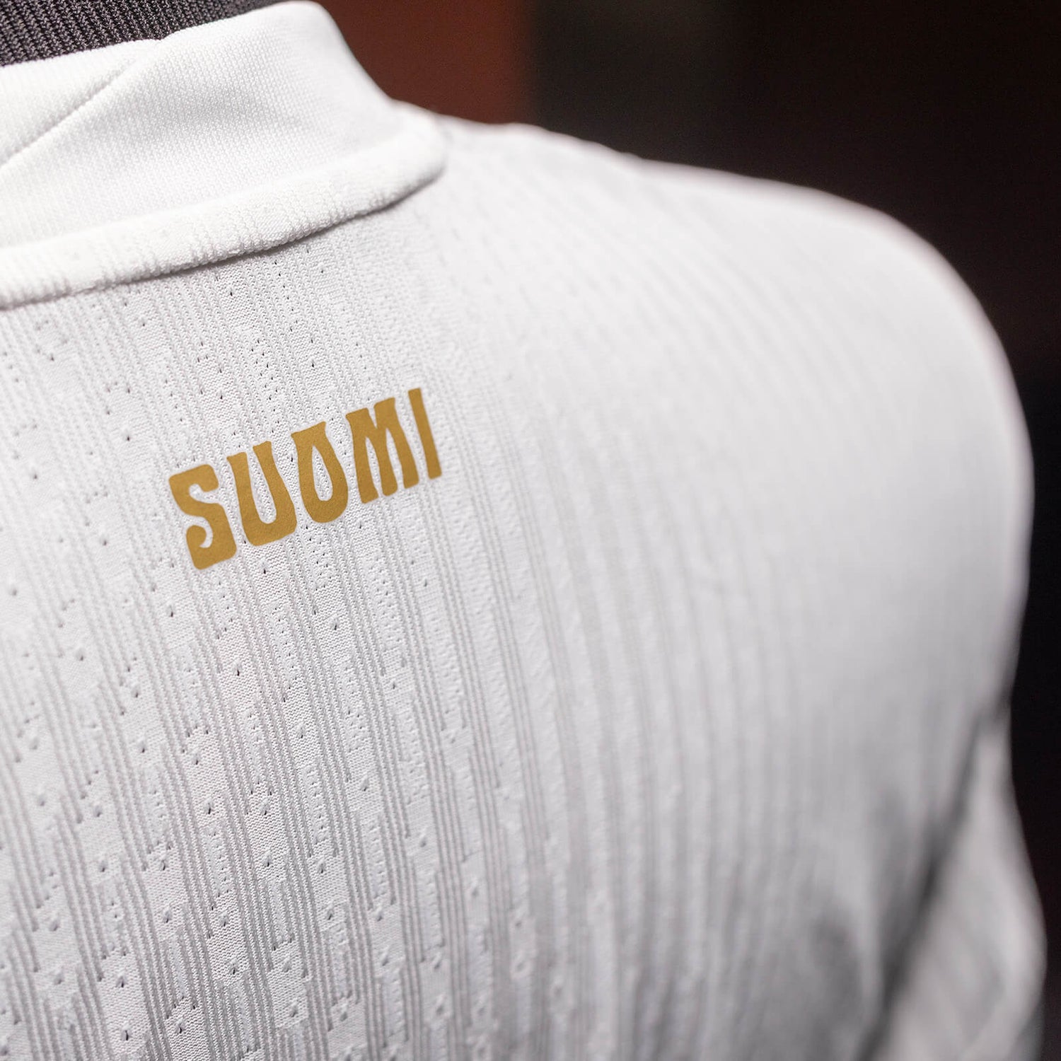 A typeface inspired by Art Nouveau architecture is used for player names and numbers, with the word 'SUOMI' printed in gold on the back collar in the same style.