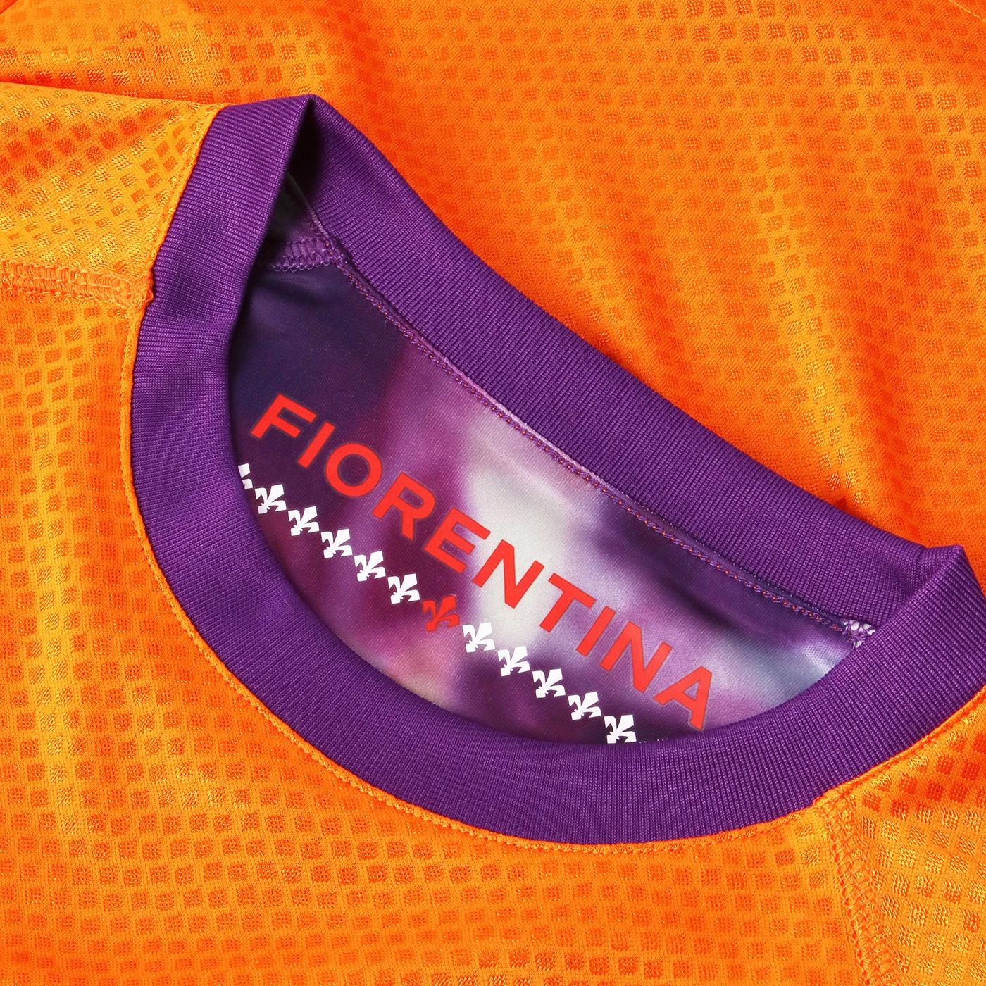 The first side of the Fiorentina football shirt features an orange base with a textured mesh structure and purple detailing. Printed elements include the club’s stylised fleur de lis on the left chest, Kappa branding on both shoulders, and a purple Mediacom sponsor across the front. The collar is trimmed in purple, while the sleeve ends show a transition between the orange fabric and the colours from the reverse layer. Fiorentina wording appears inside the neckline, accompanied by a sequence of fleur de lis symbols. A Kombat System tag sits near the hem, identifying the construction used across the 25/26 range.