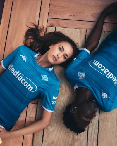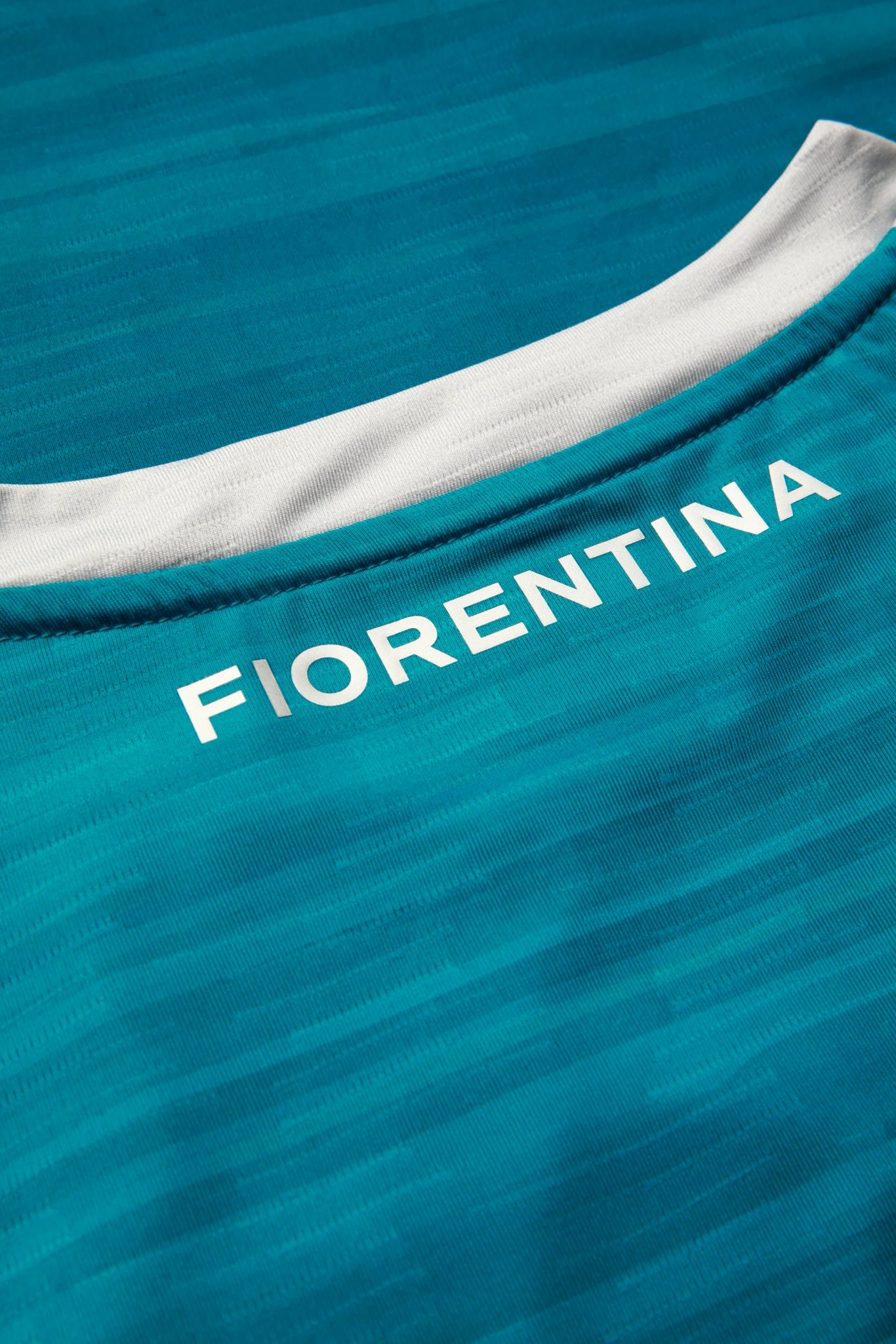 The Kappa shirt features a teal blue colour with subtle wave-like patterns that reference the flowing water of the Arno.