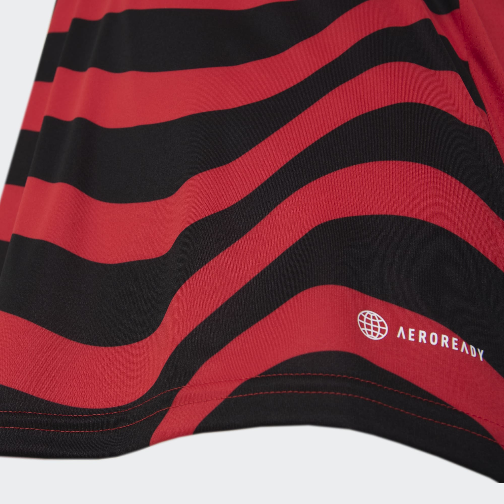 The adidas “3” release for the Brazilian giants is in red with a trunk embellished with wavy-and-angled black striping, nodding to the fanbase’s importance within stadiums and beyond.