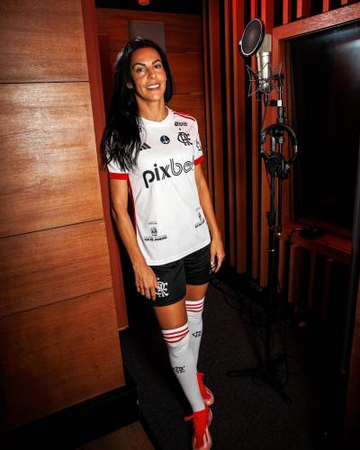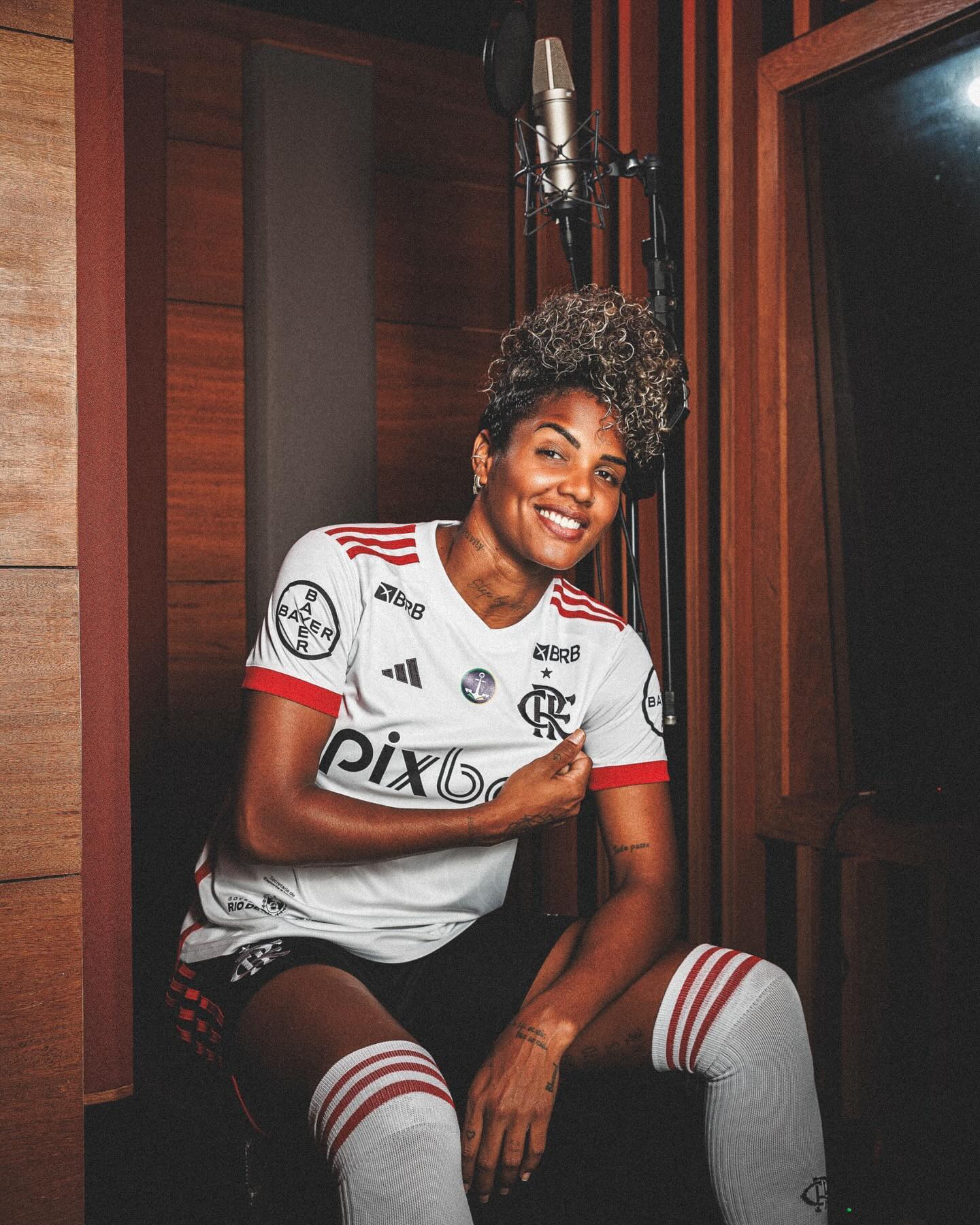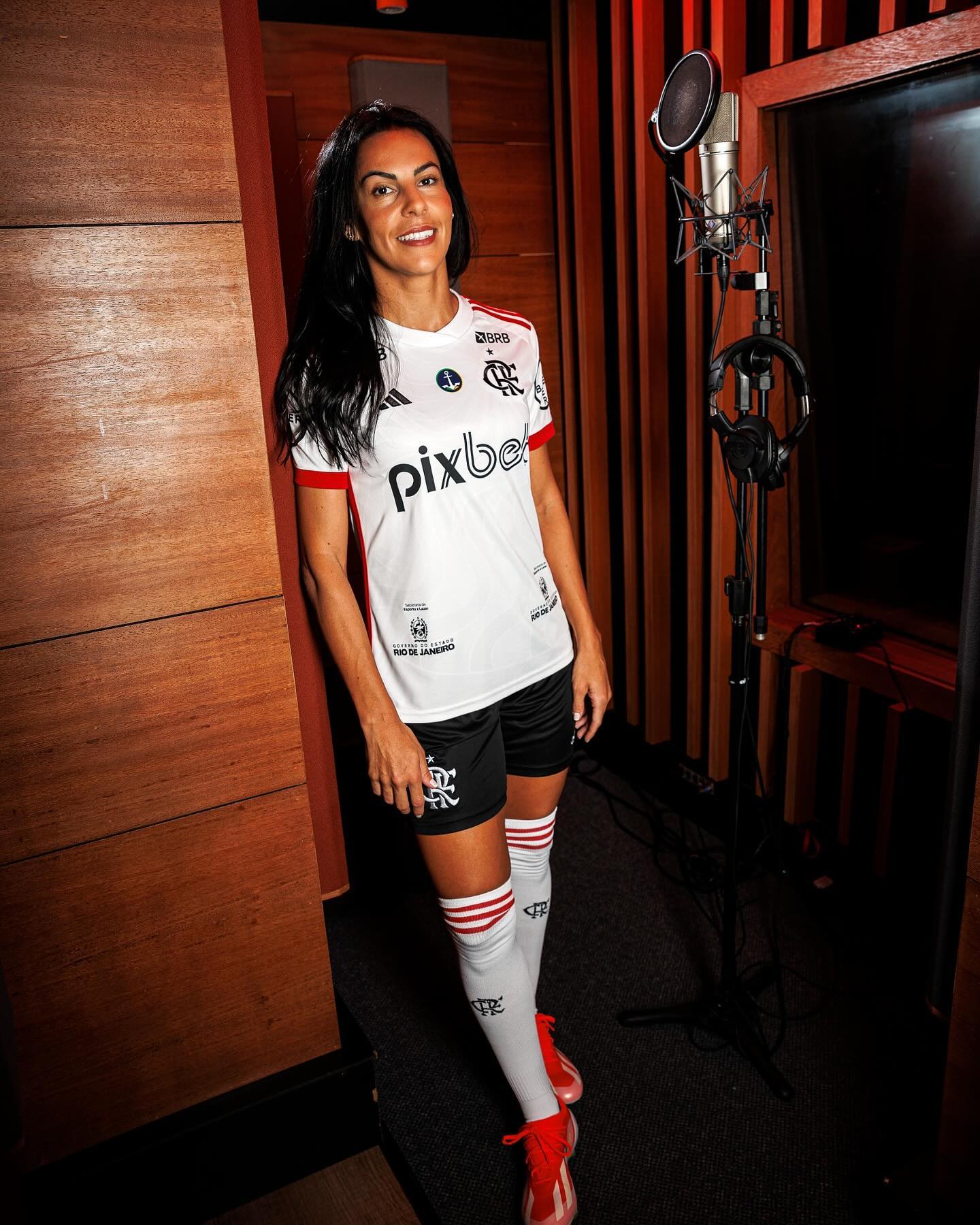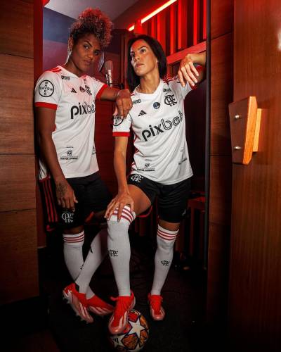 Flamengo’s 2024-25 primary change release is in white with red trim - including the German supplier’s shoulder stripes - and club and partner branding is all in black.