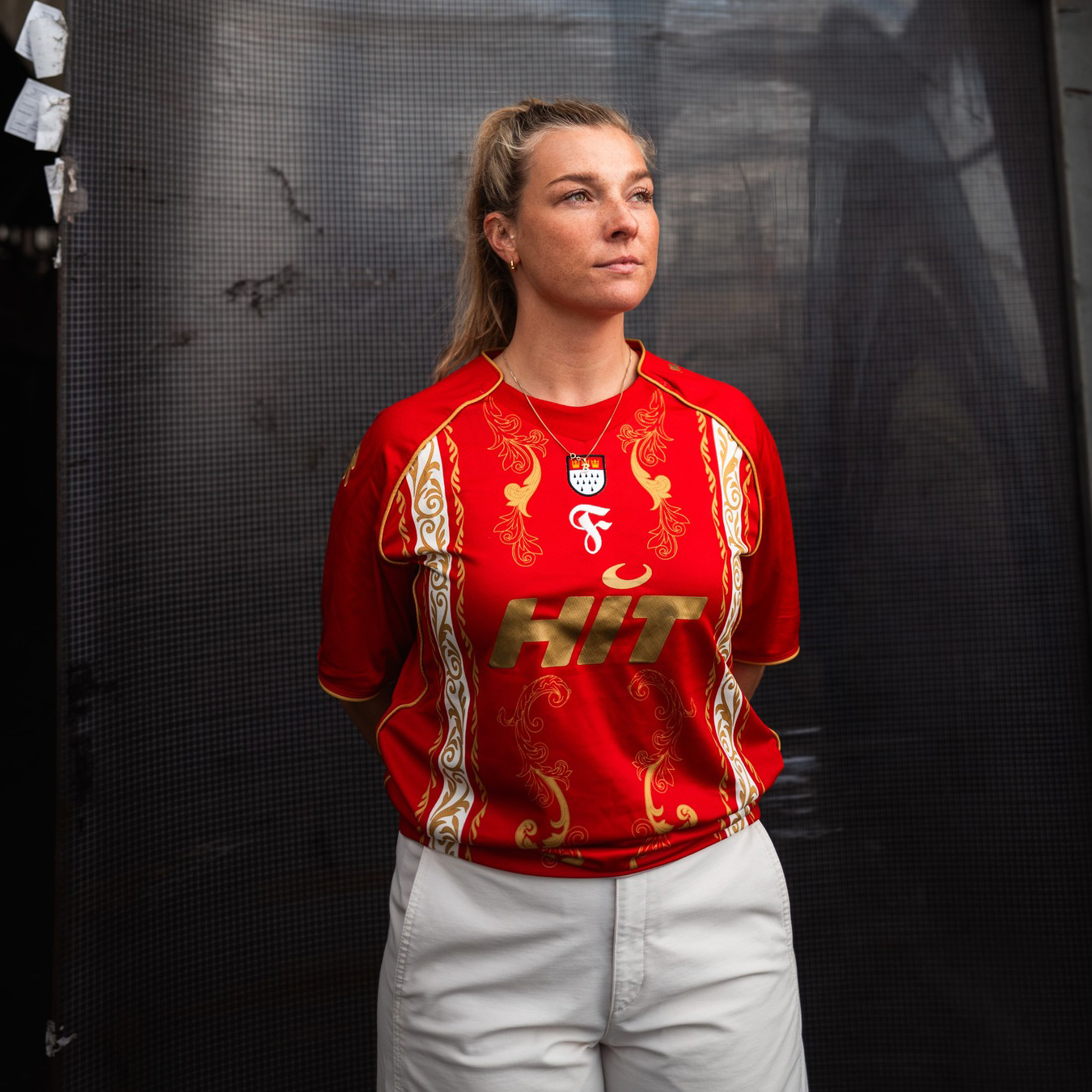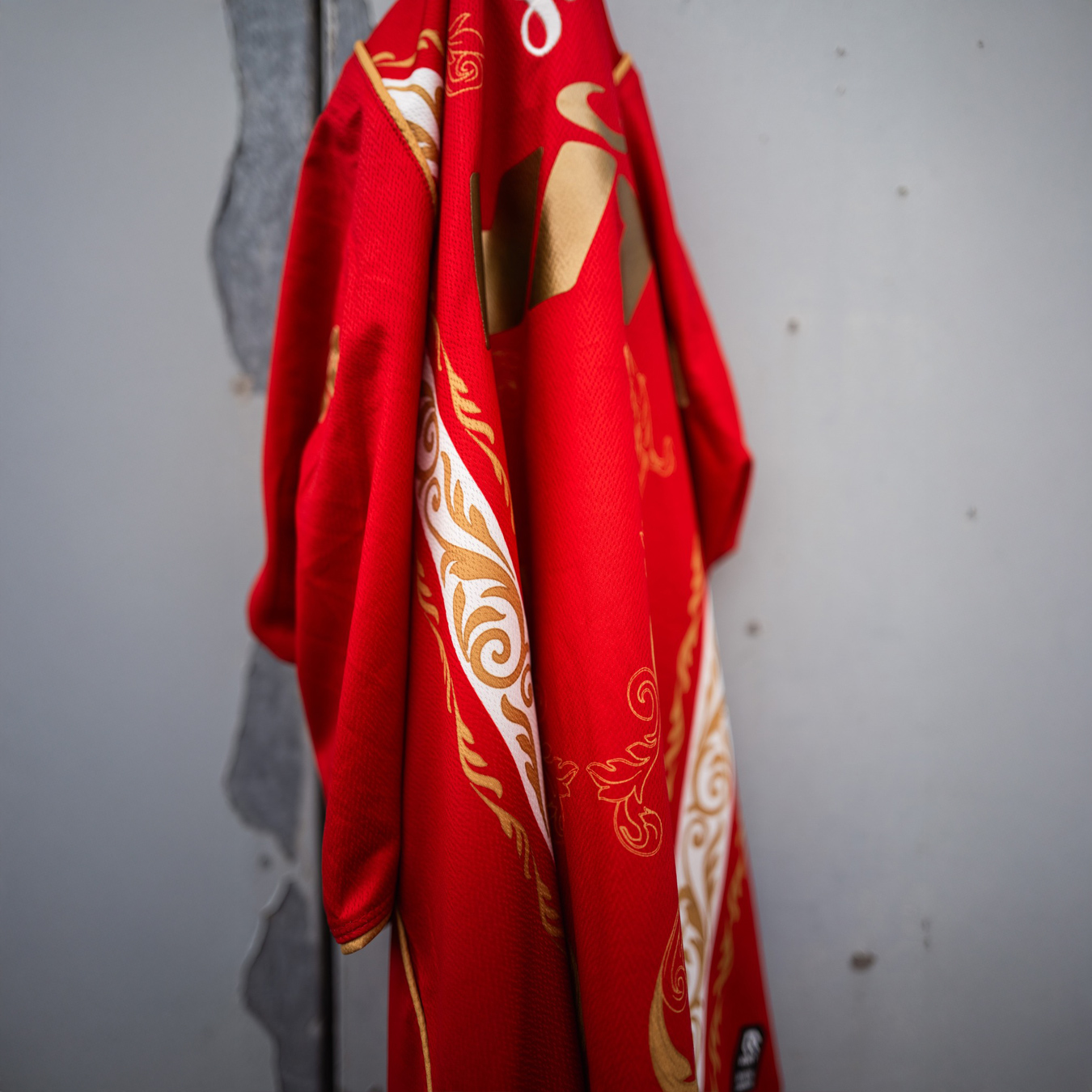 The Robey football shirt uses a vivid red base with ornate golden graphic elements arranged in vertical panels on the front and sleeves. These patterned panels run from the collar to the hem and are combined with additional decorative detailing across the chest.