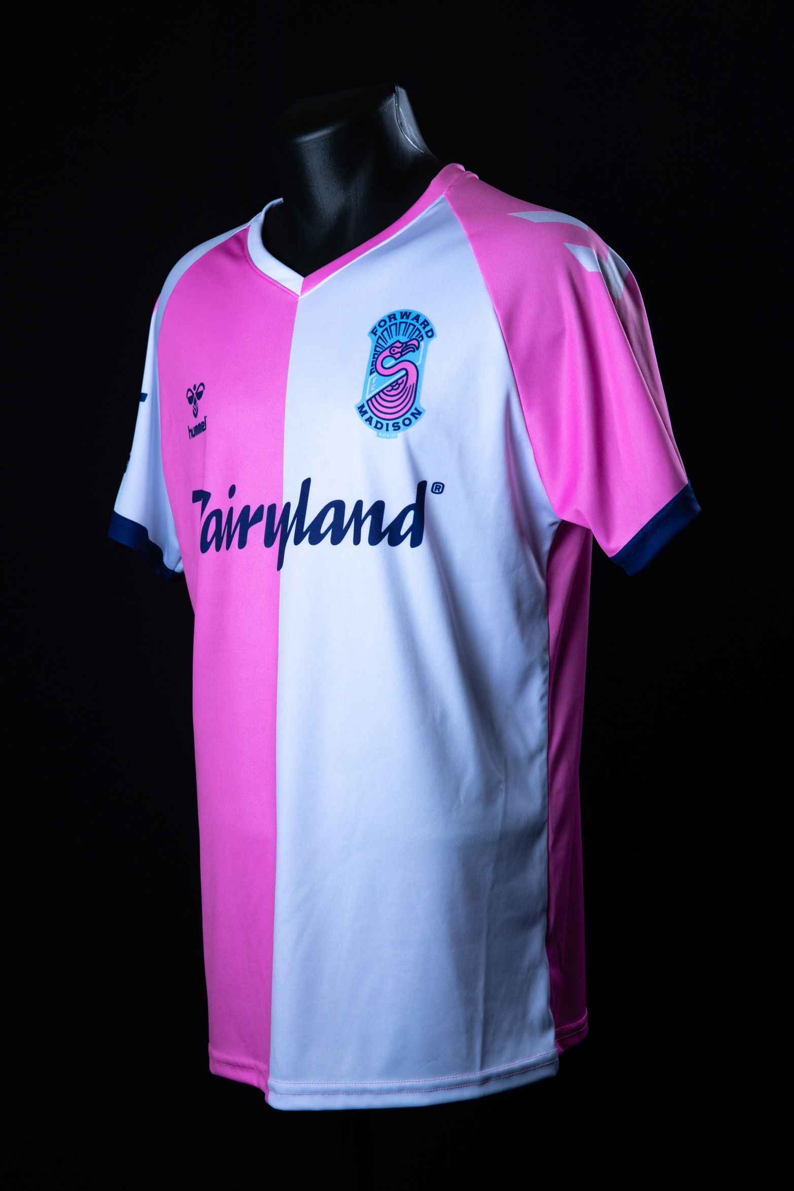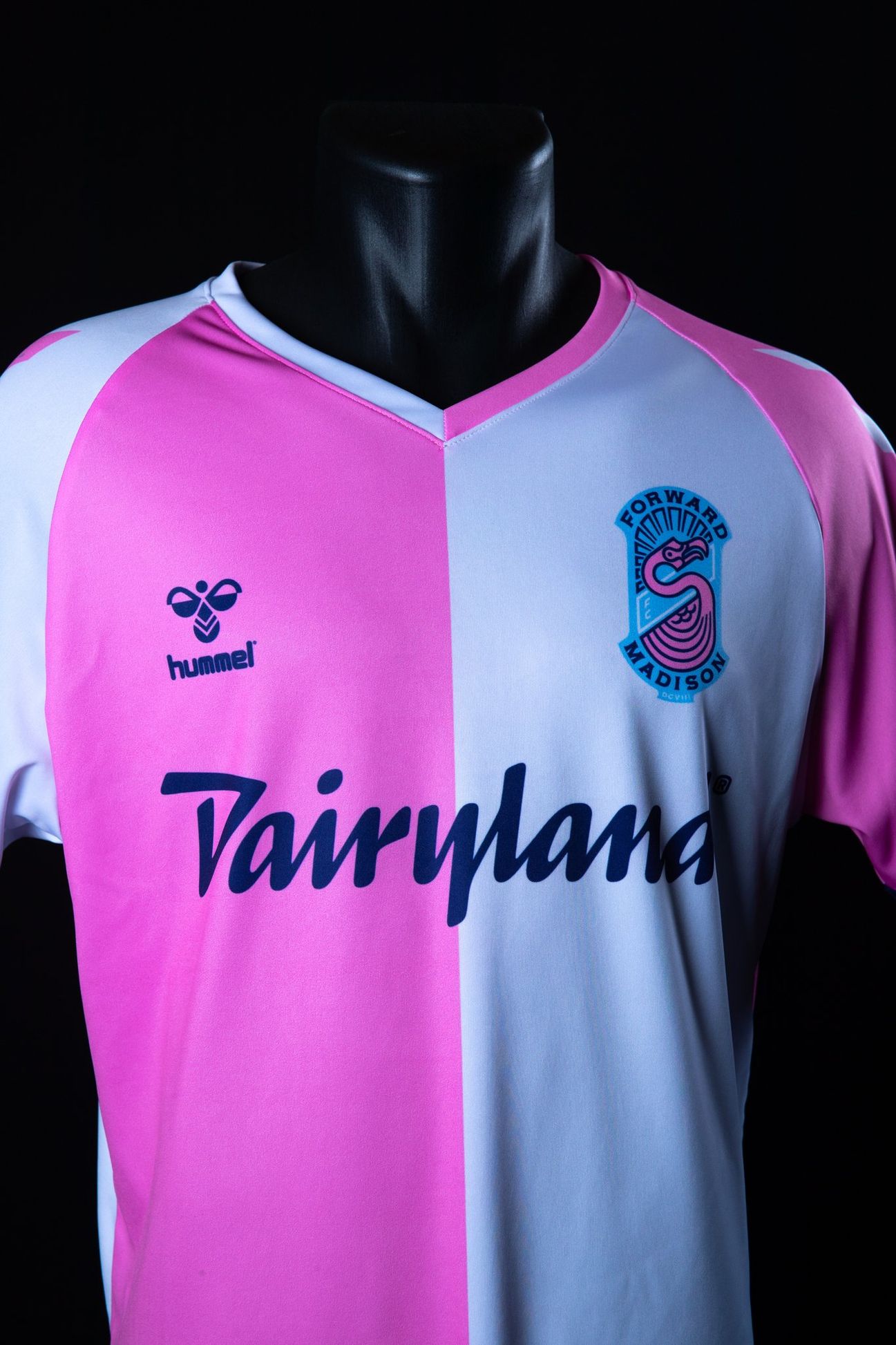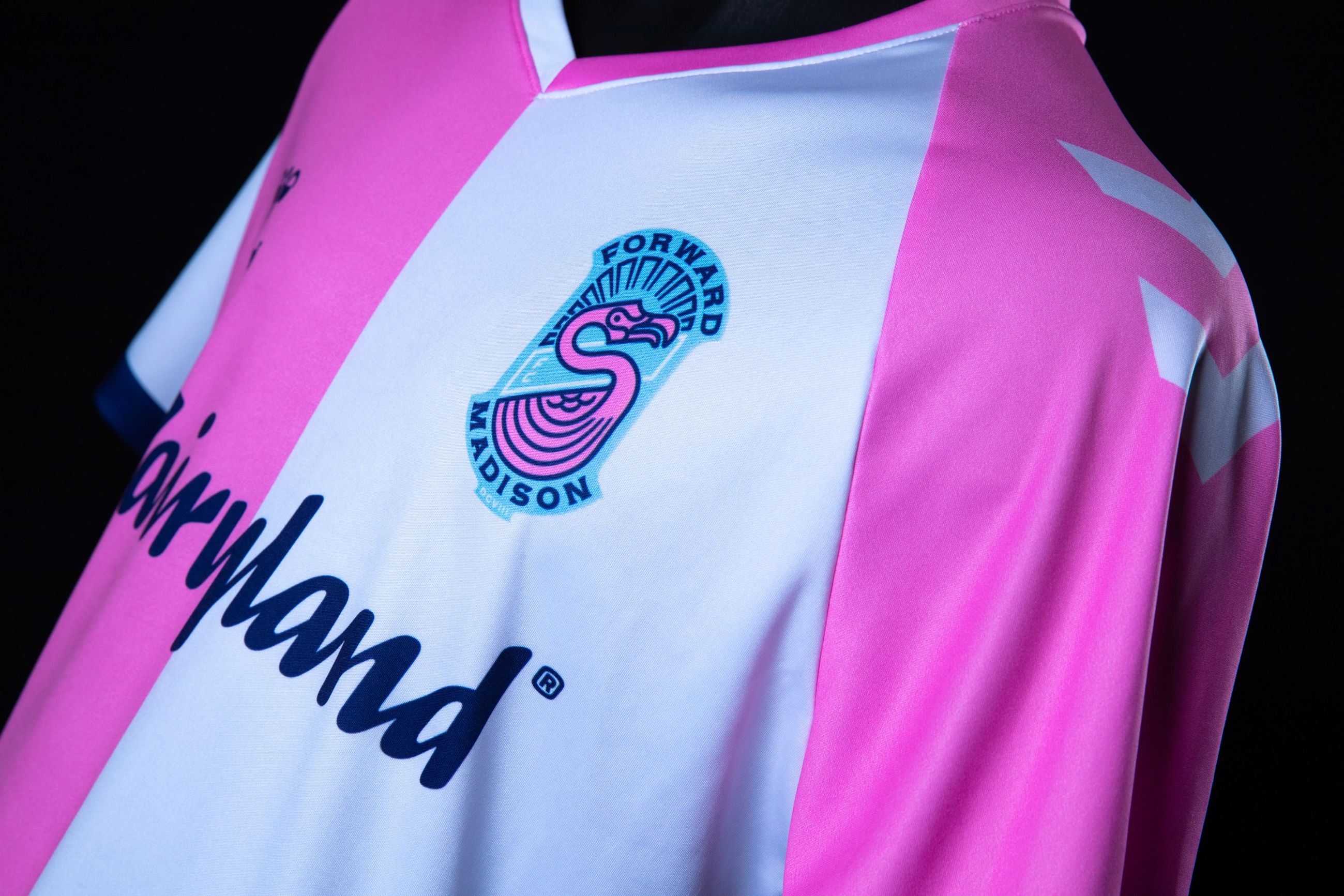 This kit was designed by the Flock, Forward Madison’s independent supporters group, which continues the tradition of Flamingos Away kits being fan-designed.