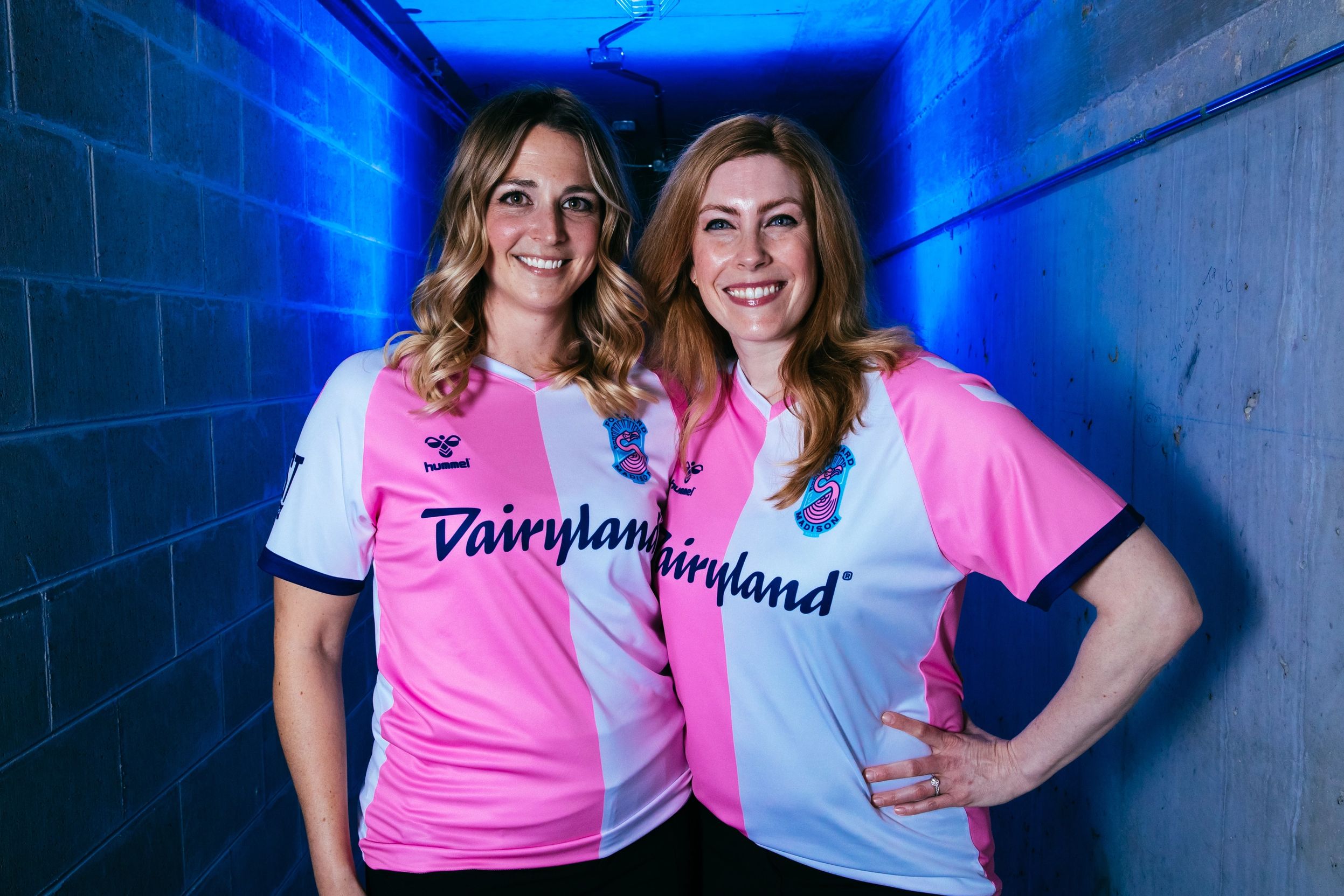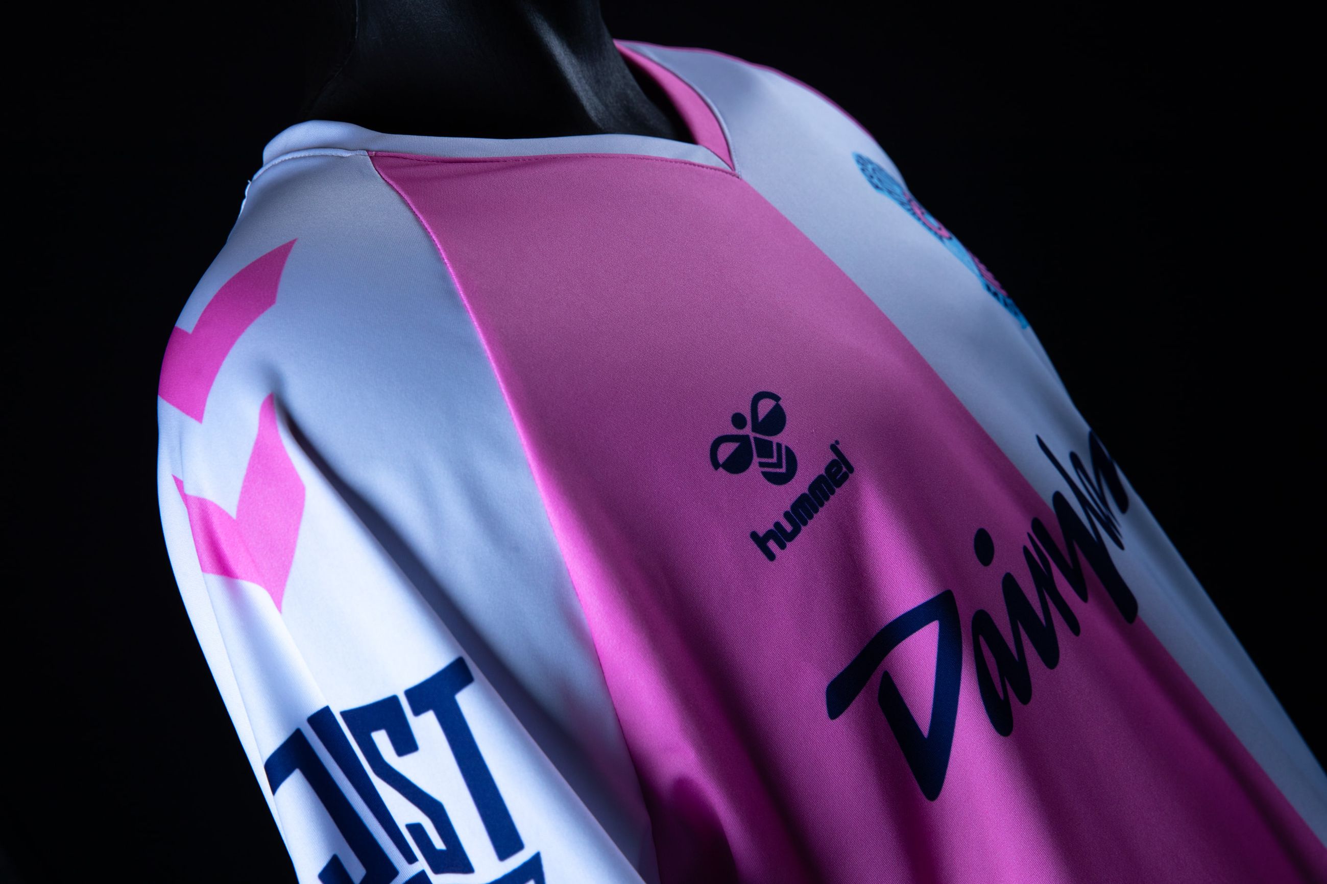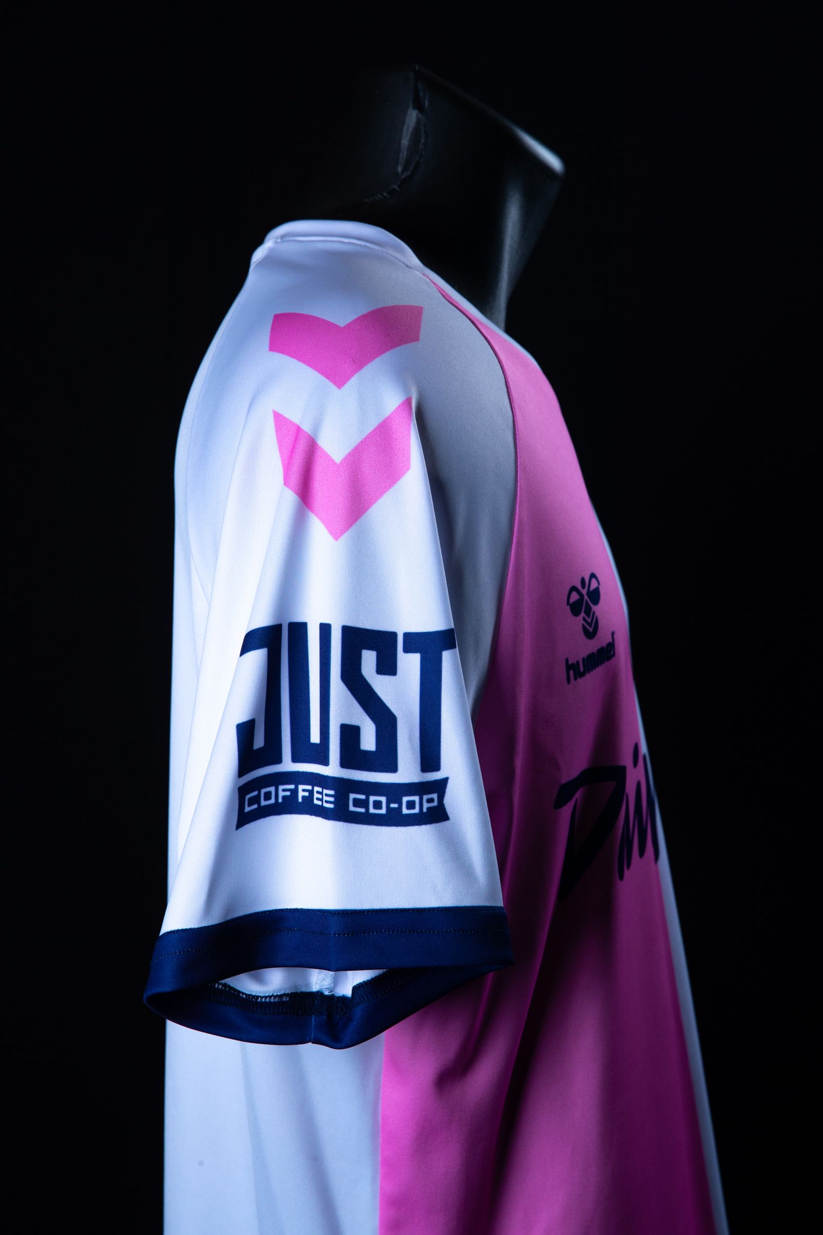 The 2022 Away Kit features a split pink and white design with dark blue sleeve caps. The design continues onto the collar as well as the back of the kit.