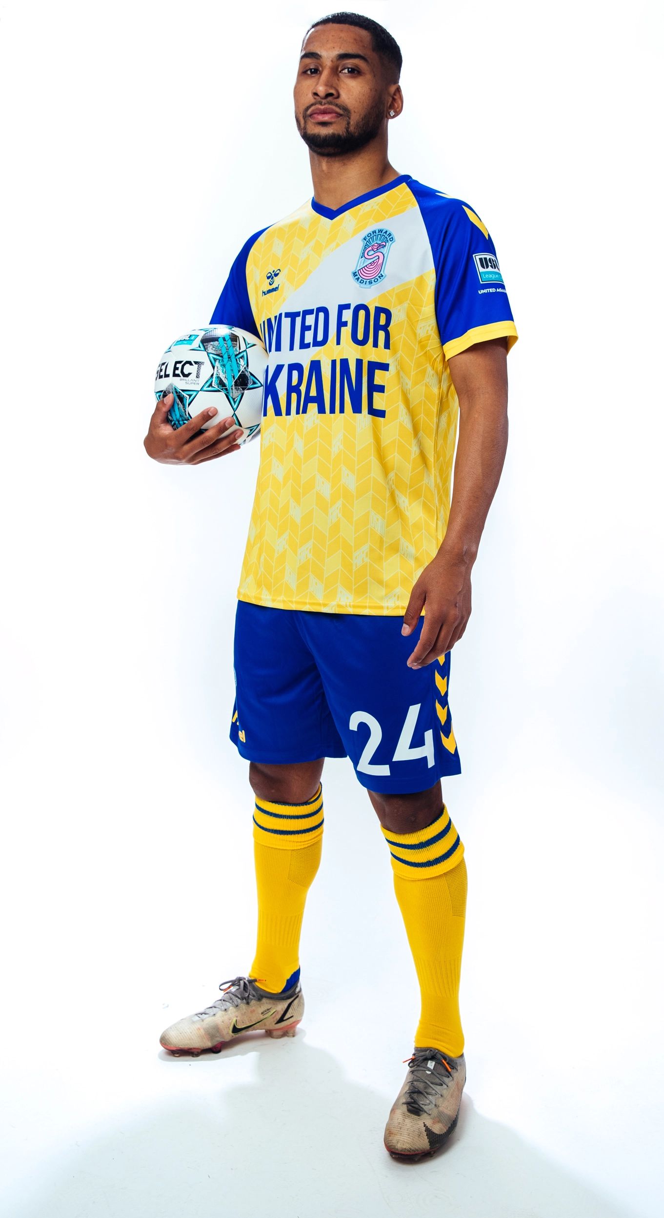 The Ukrainian Relief Kit takes Ukrainian flag colors and symbolism and integrates them into the 2021/22 Forward Madison home kit design.
