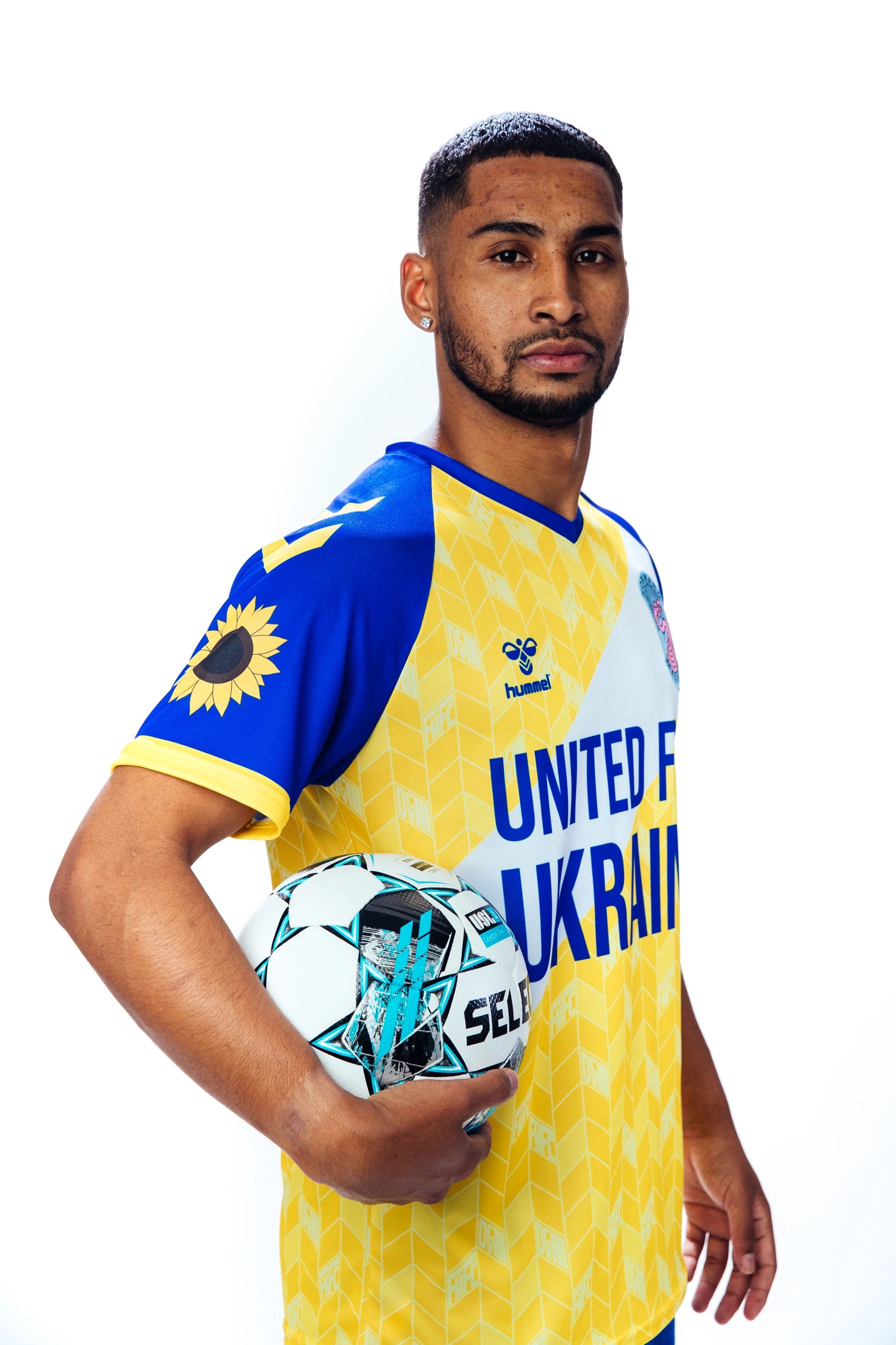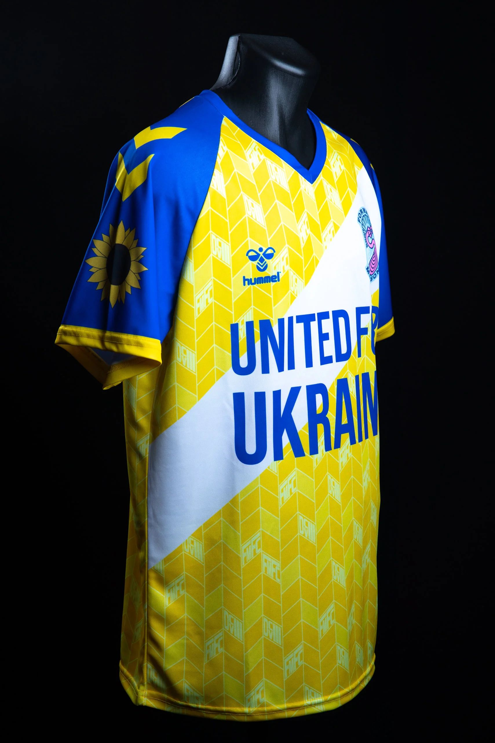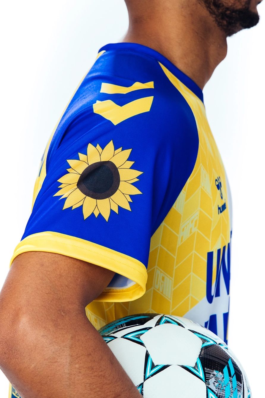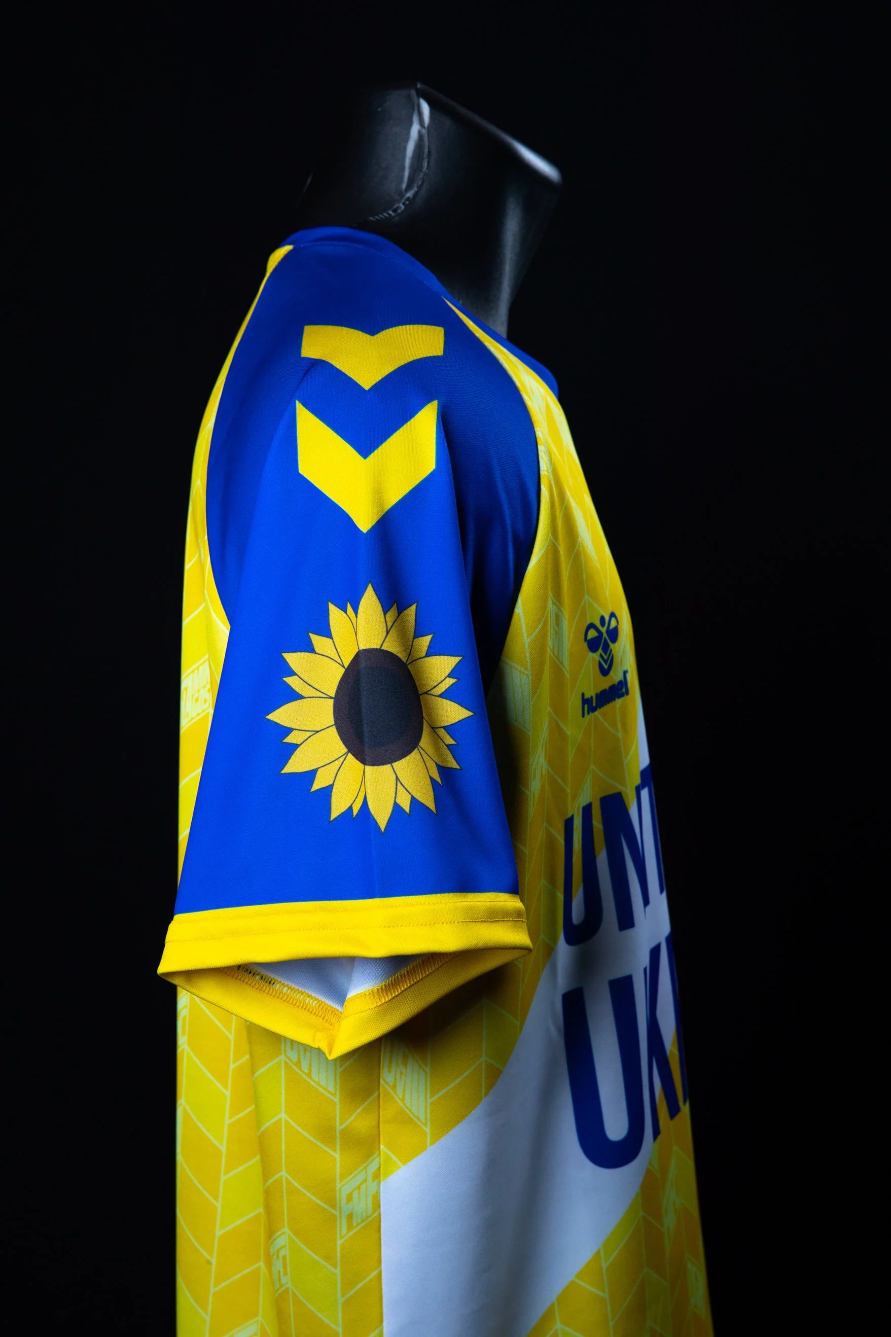 “UNITED FOR UKRAINE” is proudly displayed on the front of the kit. A sunflower, a symbol of resistance in Ukraine, adorns the sleeve of the jersey.