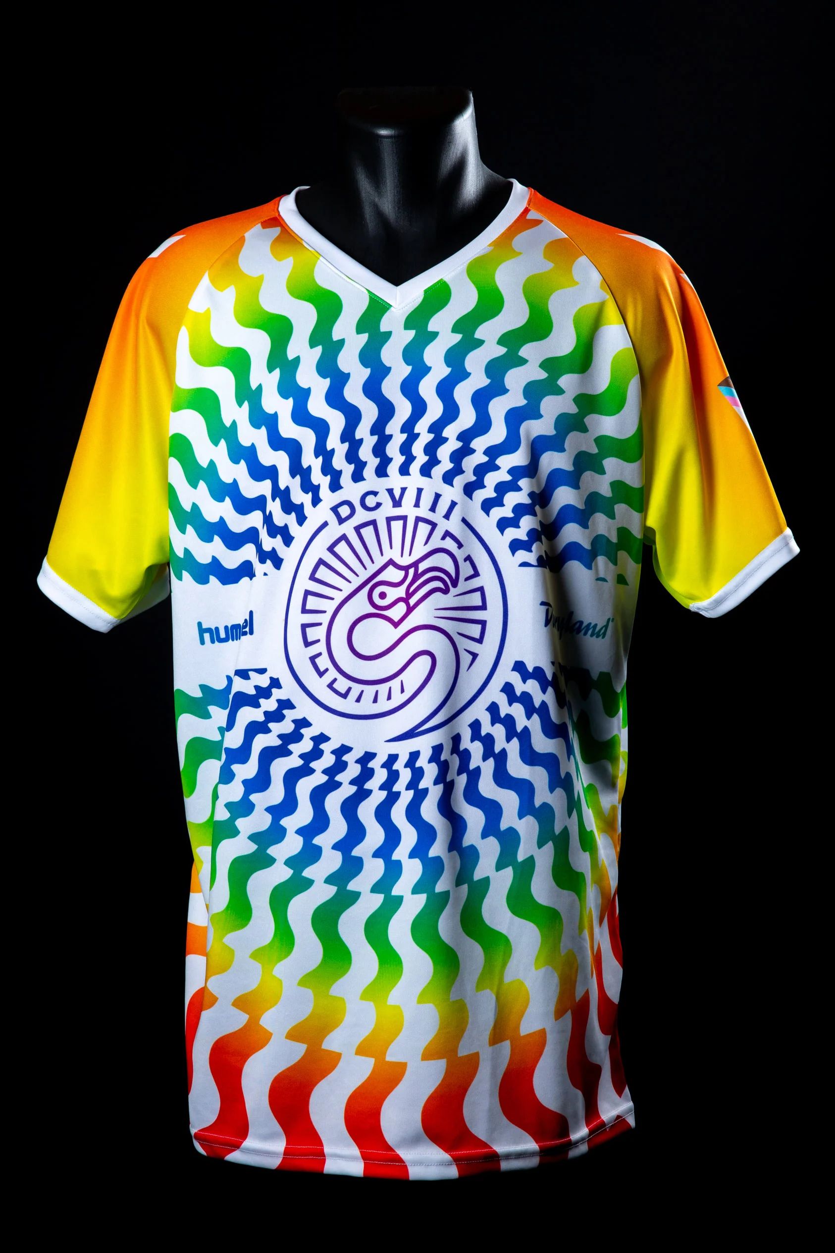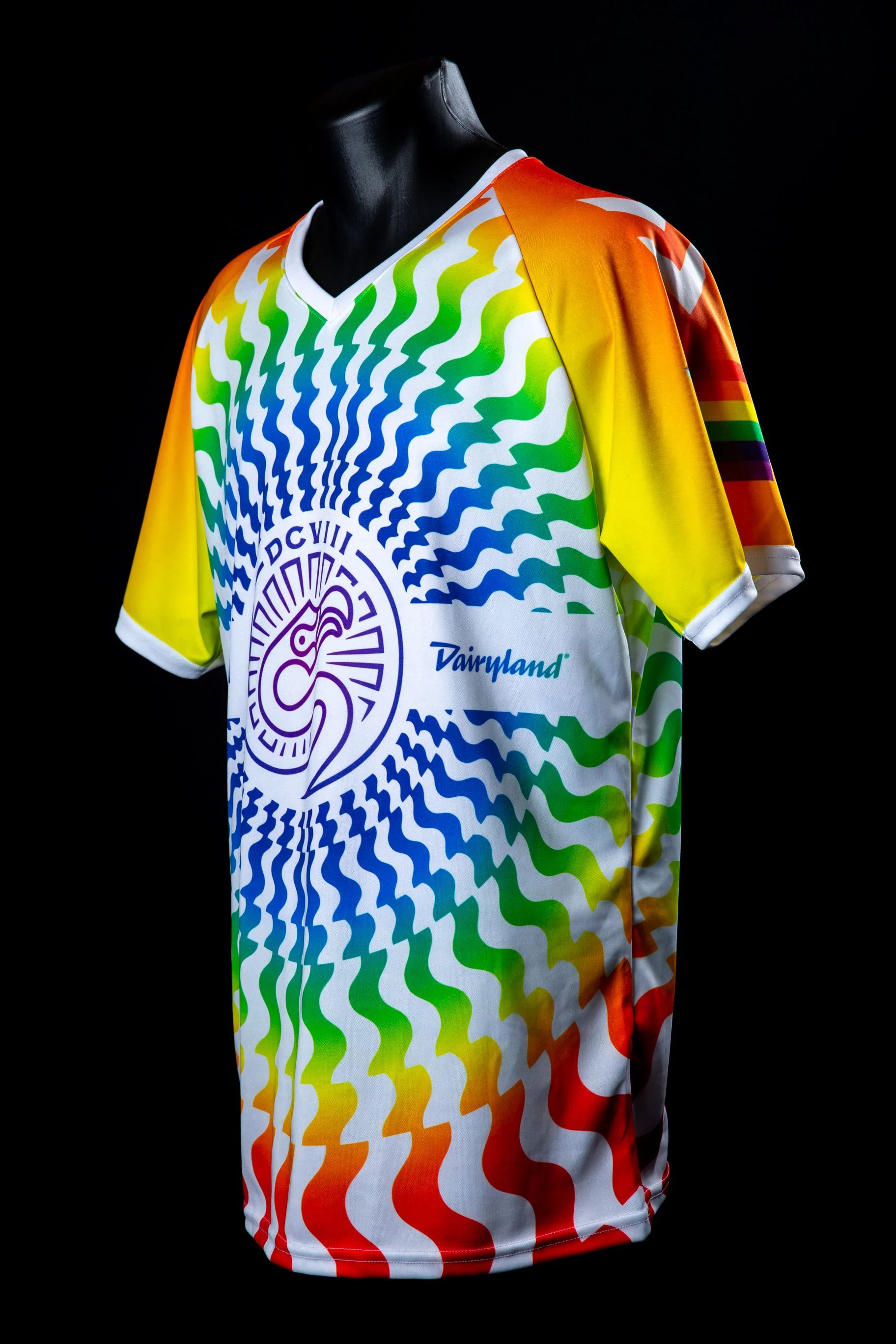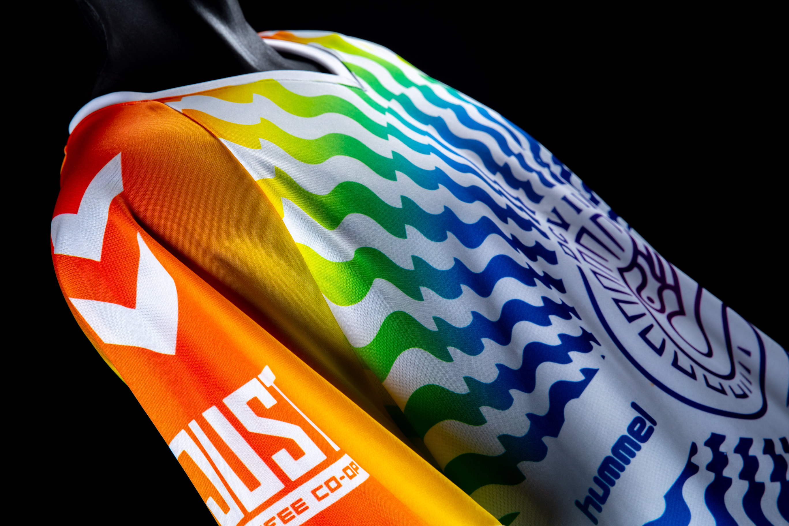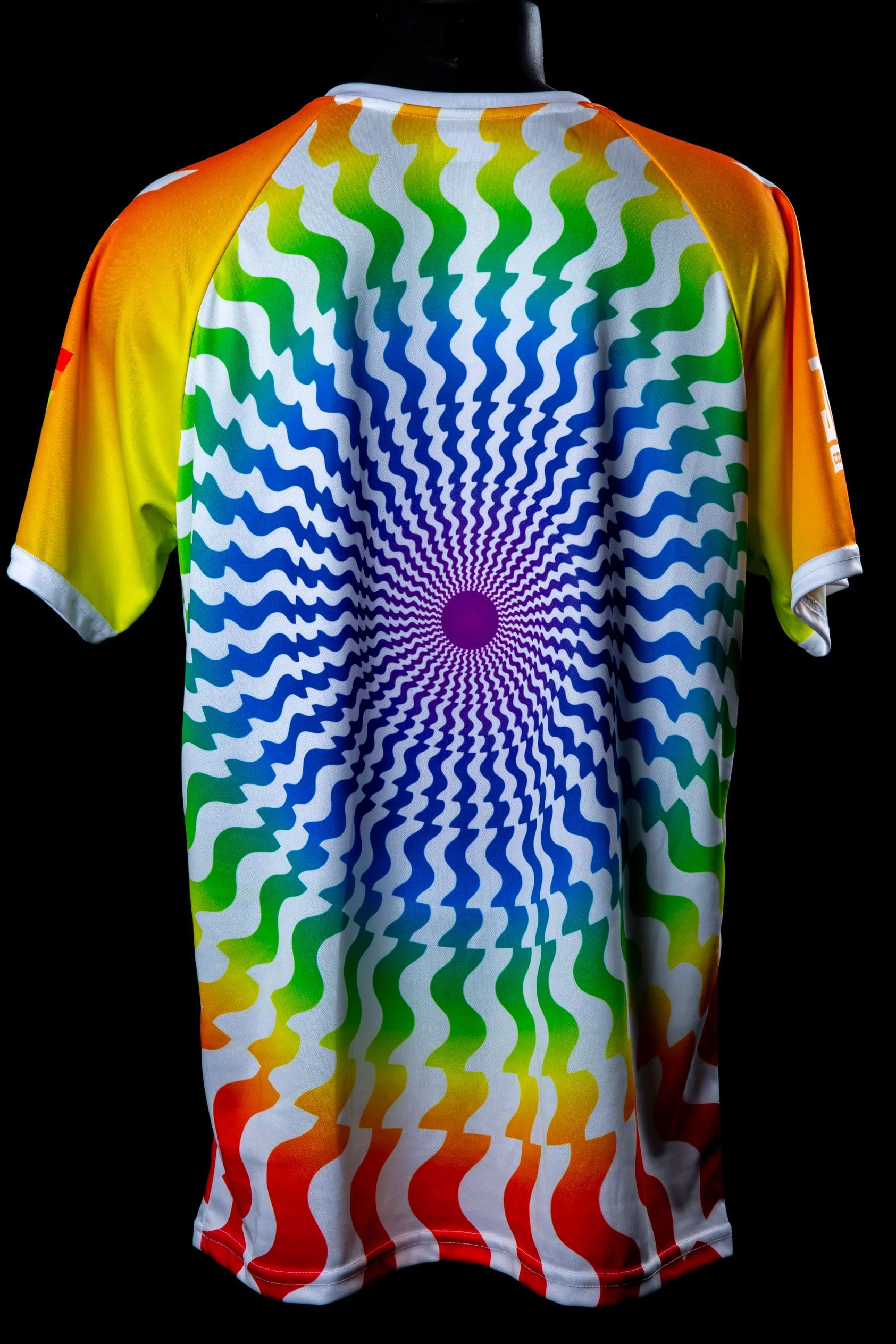 This top features a rainbow spiral design centered around the FMFC alternate crest. The design continues on the back of the kit as well.