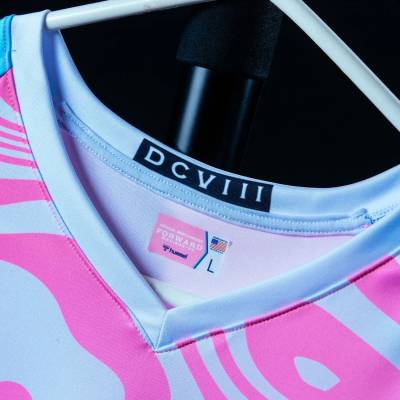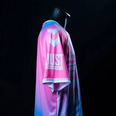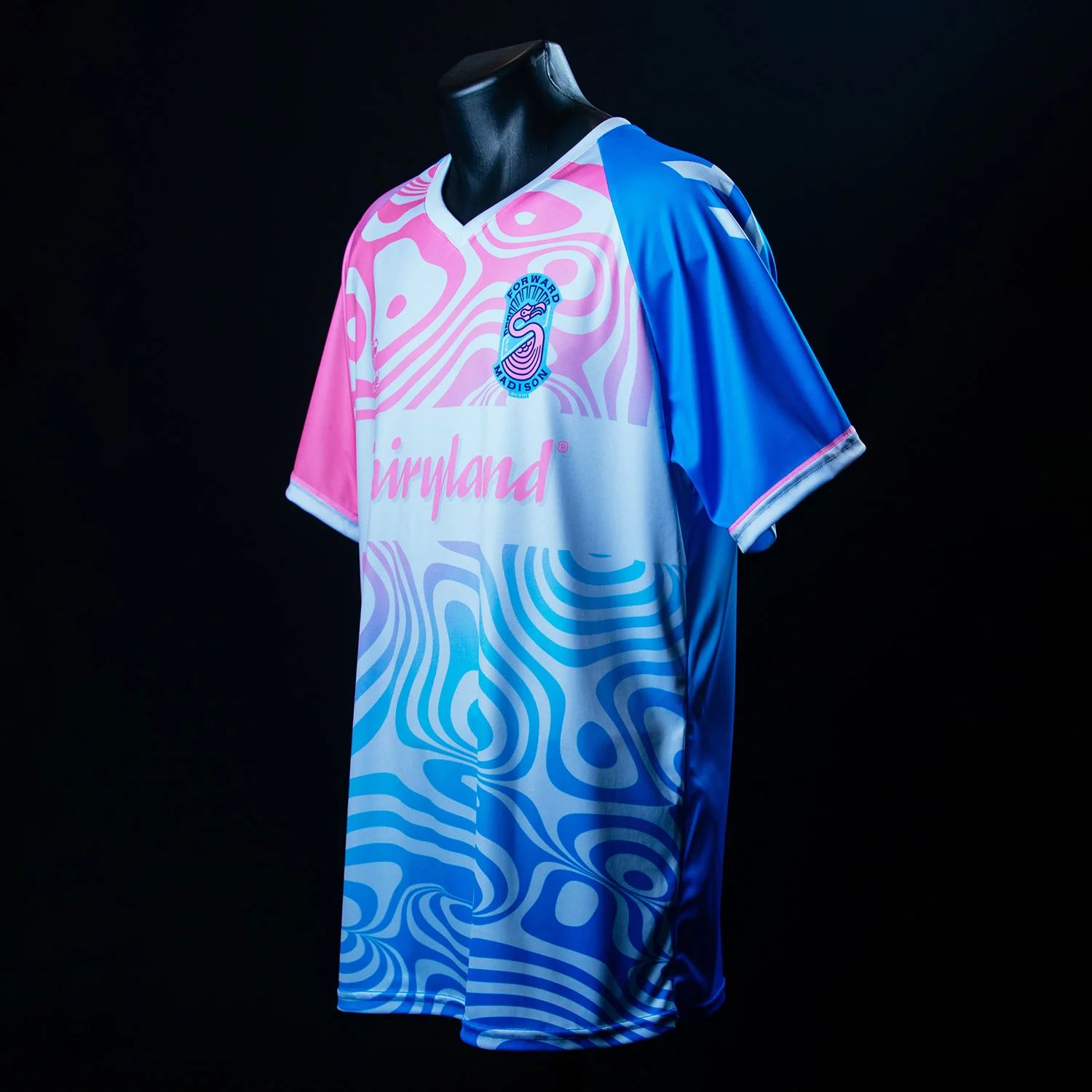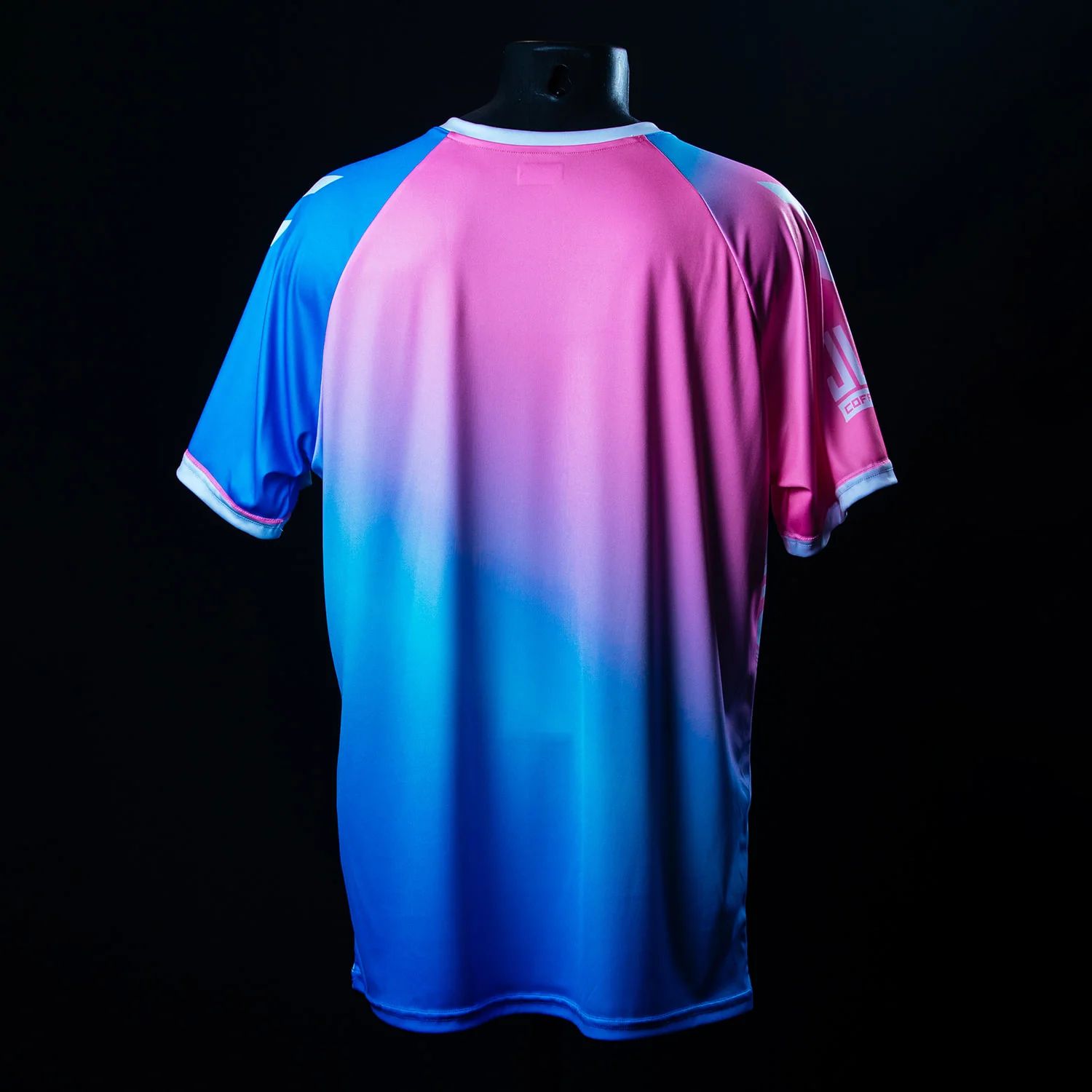 Dubbed as the Lava Lamp Pre-Match Top, this shirt showcases a combination of pink and light blue hues, with one pink and one light blue sleeve.