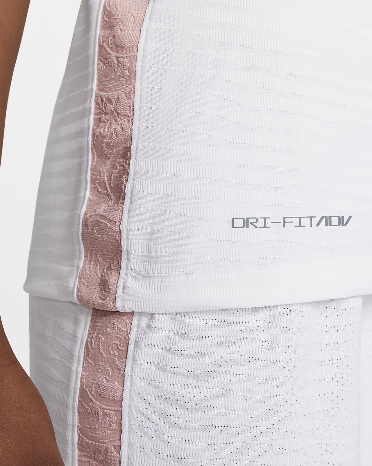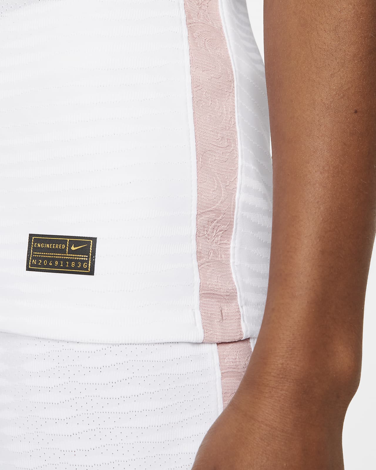 The Swoosh logo appears in navy on the shirt, as well as on the white shorts and pink socks which complete the Euro 2022 kit.
