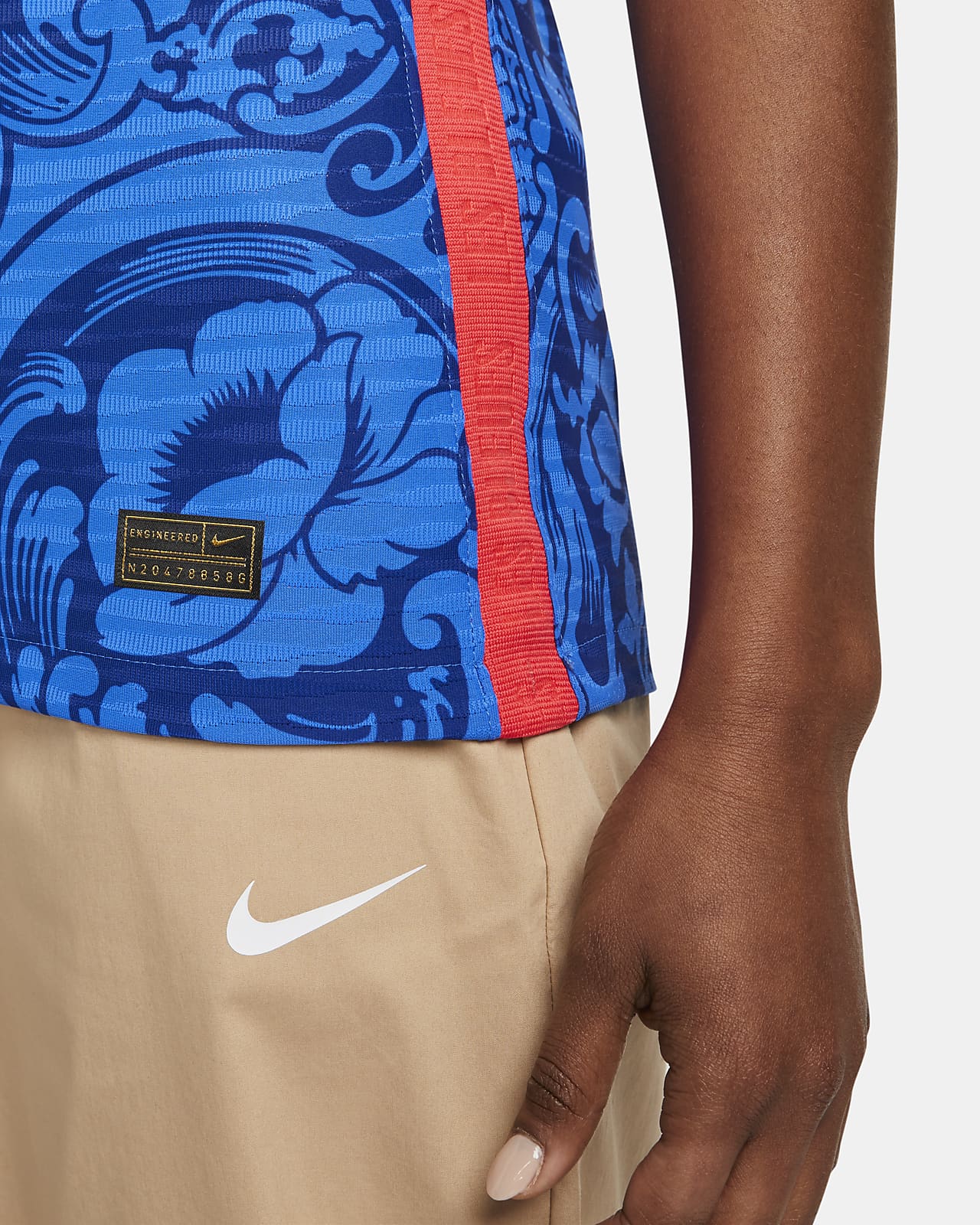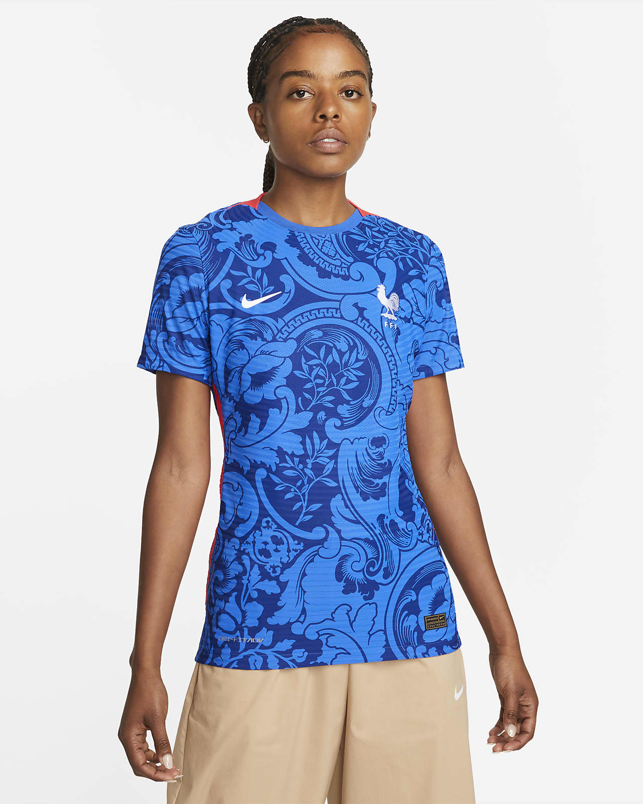 Heavily patterned with references to neoclassical art and architecture, the tonal blue - “Hyper Cobalt” - base is embellished with the cockerell crest and the Swoosh logo in white, while the sides of the trunk have red trim featuring “LES BLEUES” script.