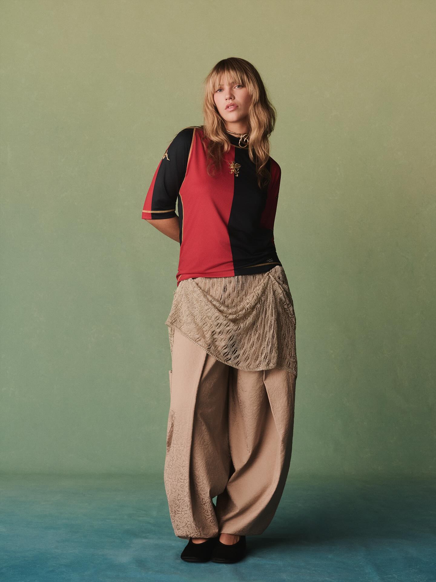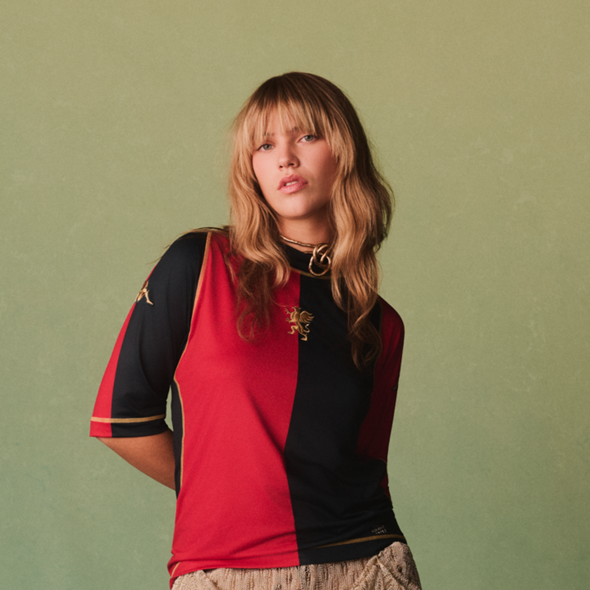 The Kappa shirt features Genoa’s traditional half-and-half layout in red and navy, highlighted by gold stitching and a minimalist construction. A golden Griffin emblem sits on the chest, while the sleeves display the classic Kappa Omini logos.
