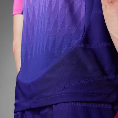 White is used on the crest and for the enlarged “3-Bar” chest logo and the kit is completed with purple shorts and socks.