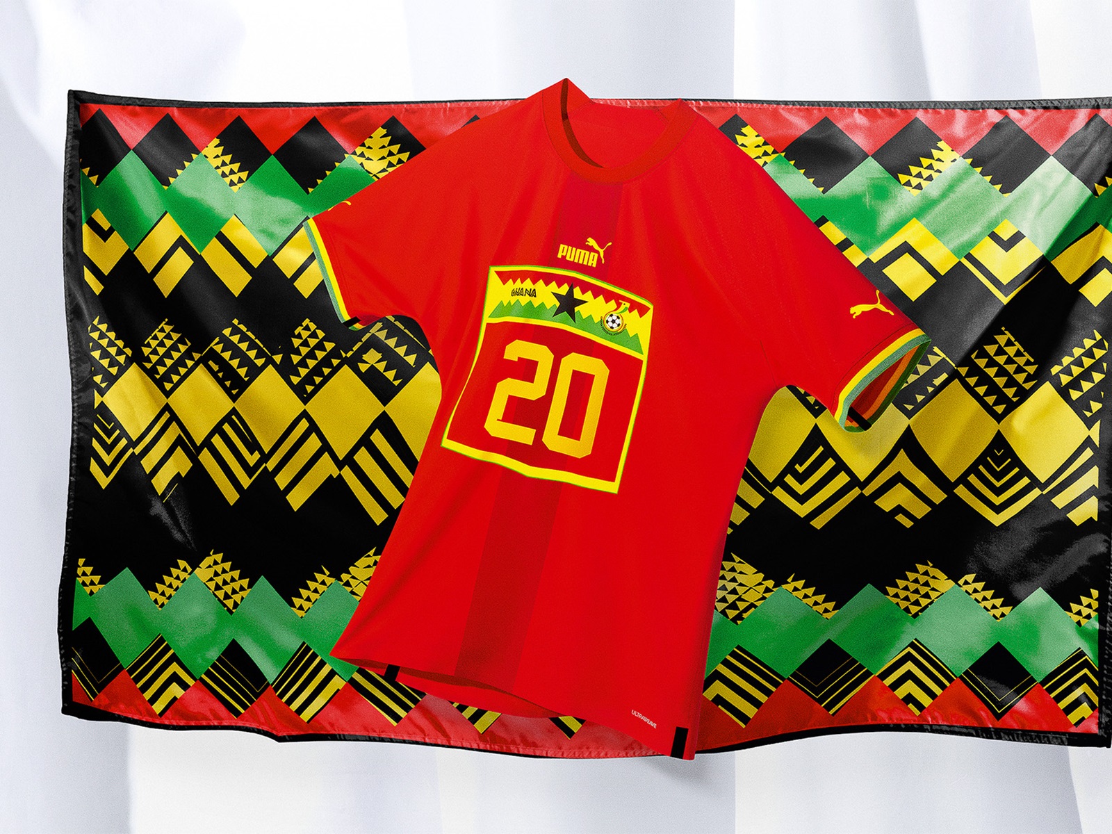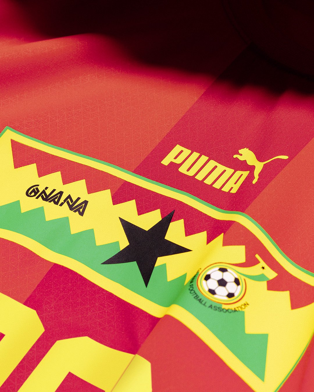 The block graphic at the center reinterprets the national flag through the visual language of traditional Ghanaian textile patterns. The “Ghana” lettering, federation emblem, and the Black Star of Ghana complete the statement.