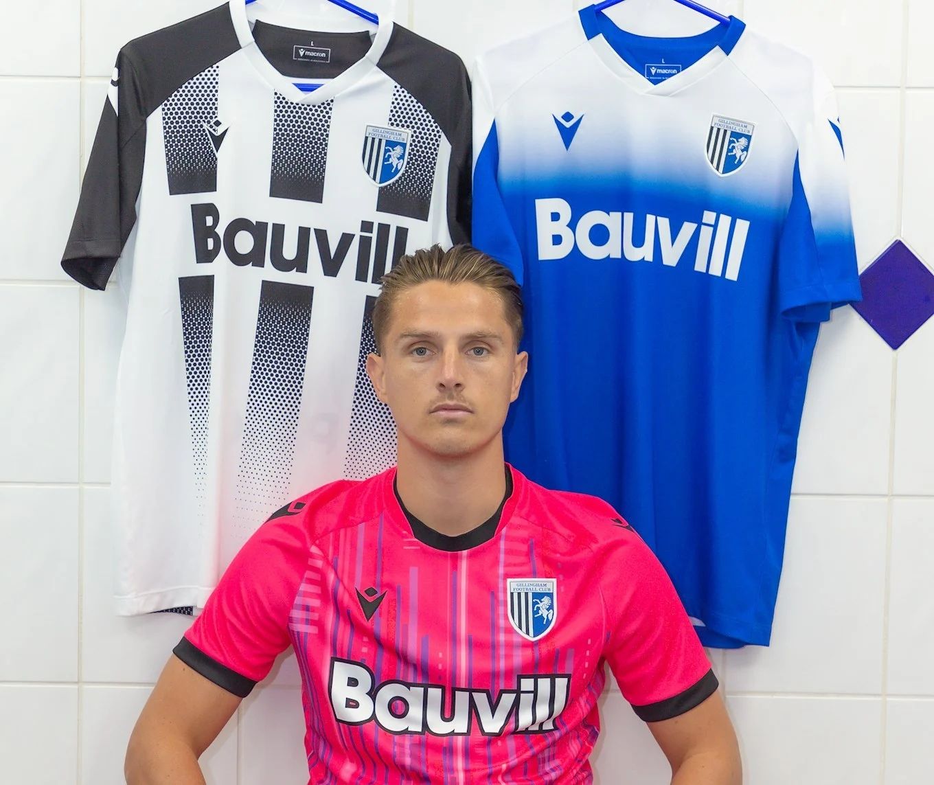 The nominally secondary-change release for the Gills’ 2023-24-season EFL League Two campaign is in pink with white, blue and purple graphical decoration to the trunk, while trim and the supplier’s “Hero” logos are in black.