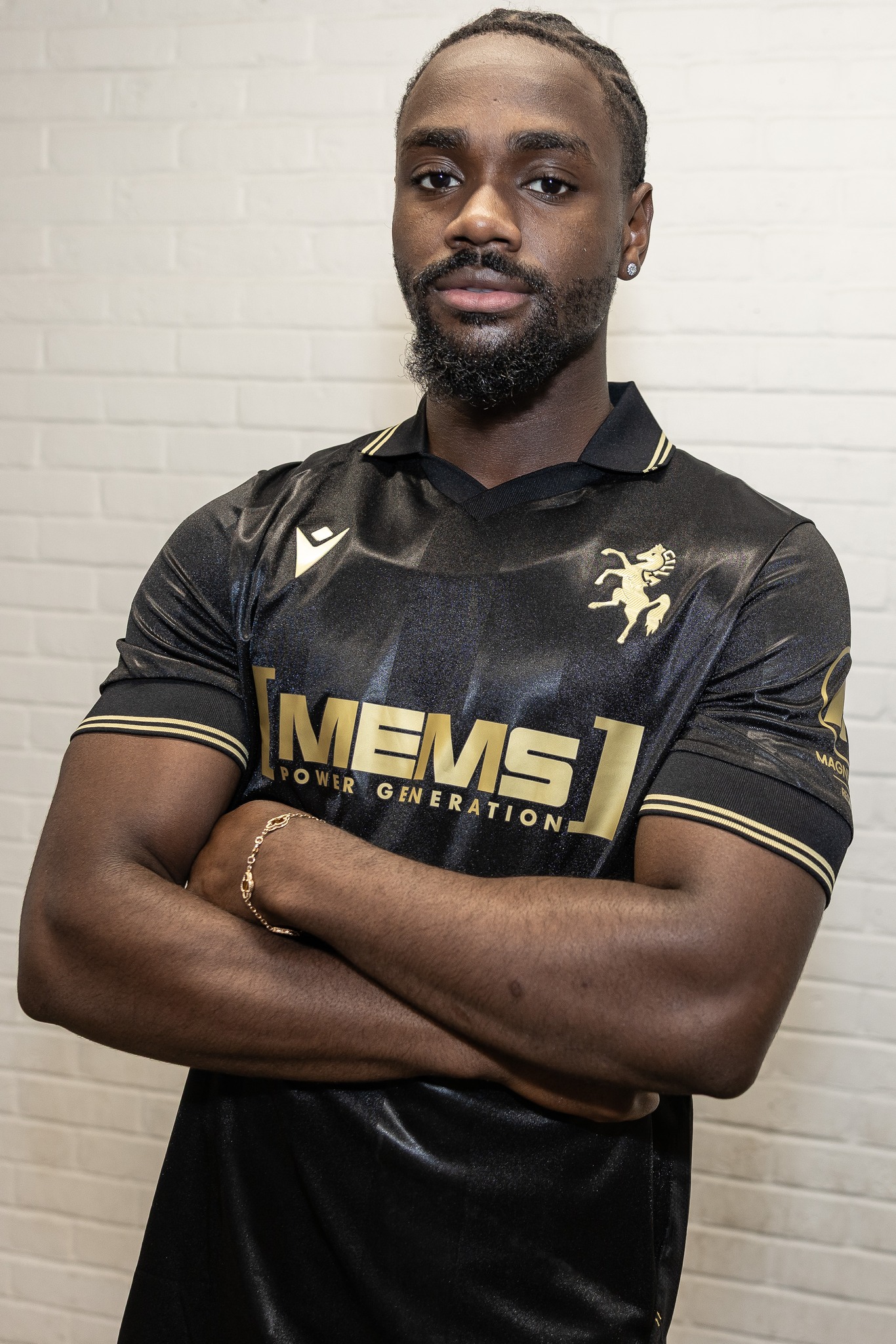 The away kit is all black with gold detailing. It includes a polo-style collar, gold sleeve accents, and matching black shorts and socks. The horse from the club crest is used as a gold motif on the upper chest. Both Macron and MEMS logos appear in gold, and C&A branding is also placed on the back.