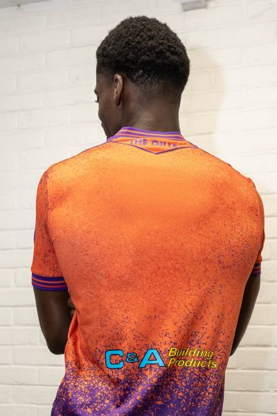 The third kit presents a high-contrast combination of orange and purple, with an orange shirt transitioning into a purple splatter gradient design. The shirt features purple sleeves and collar detailing, alongside purple shorts and socks. The crest and sponsor logos appear in purple, and “The Gills” is sublimated on the back neck area.
