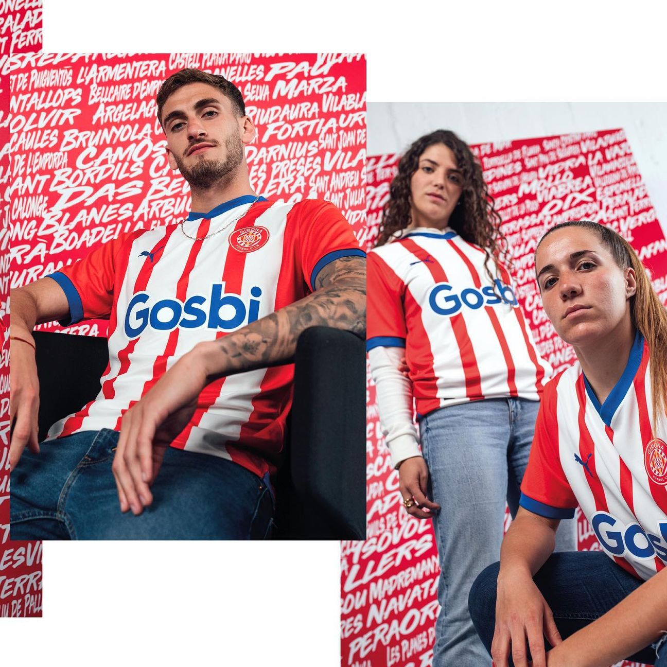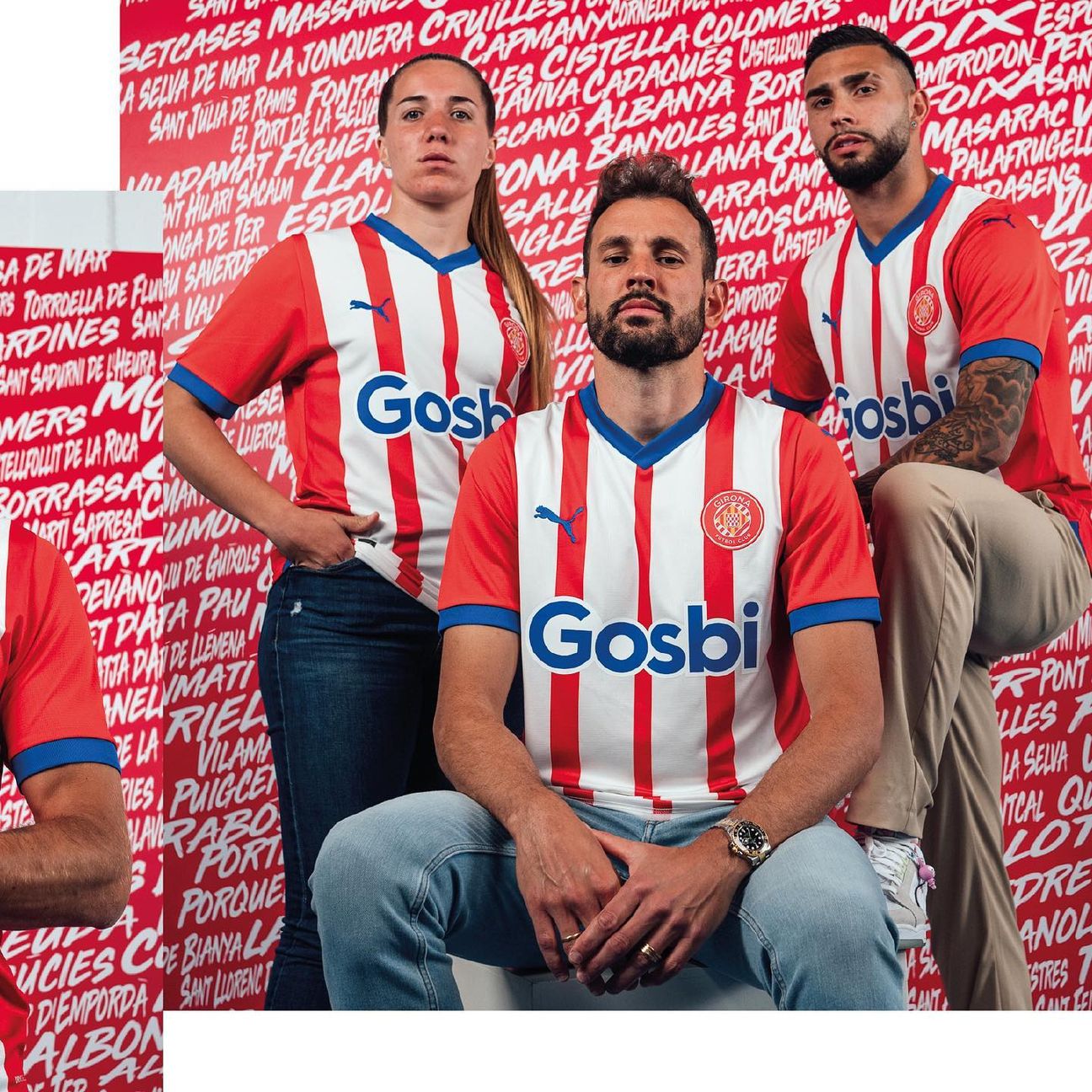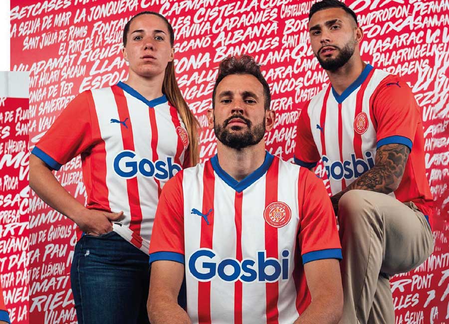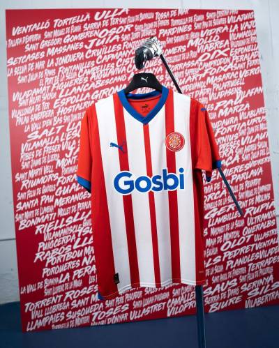 The 2023-24-season primary release for the Spanish La Liga side features red and white stripes with red sleeves and blue providing the fill for the neck, cuffs and the German supplier’s cat logo on the chest, as well as the bold “Gosbi” wordmark in the central sponsor position.