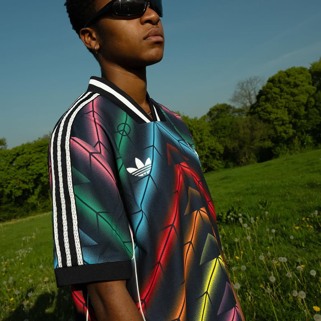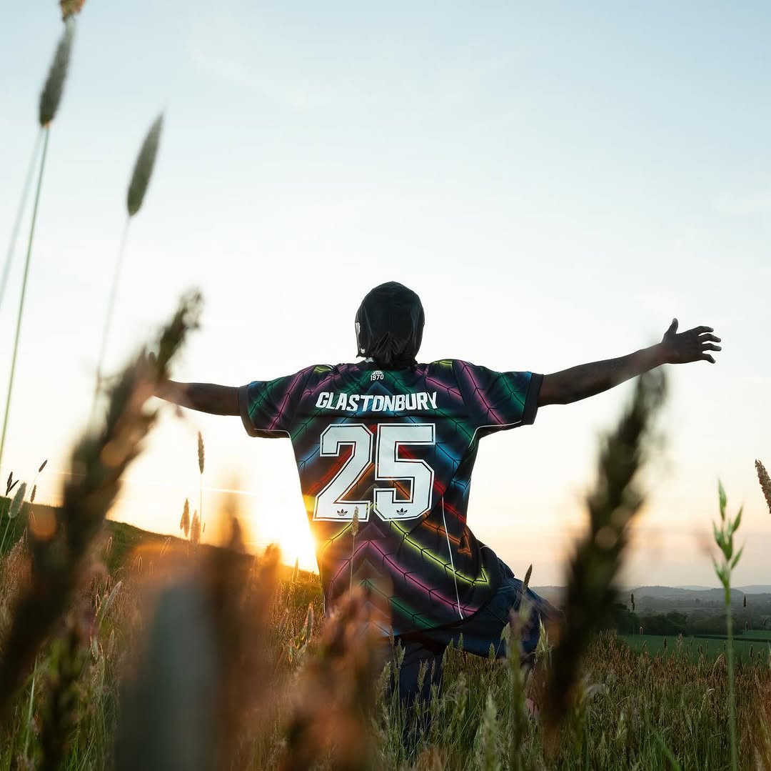 The jersey features adidas’ Trefoil logo opposite the Glastonbury Festival of Contemporary Performing Arts crest on the chest. A peace symbol is subtly integrated into the upper design. The rear displays "EST. 1970" beneath the collar, marking the year the festival began.