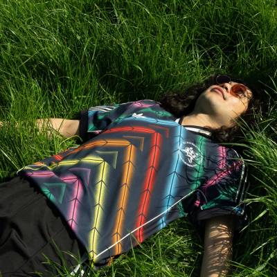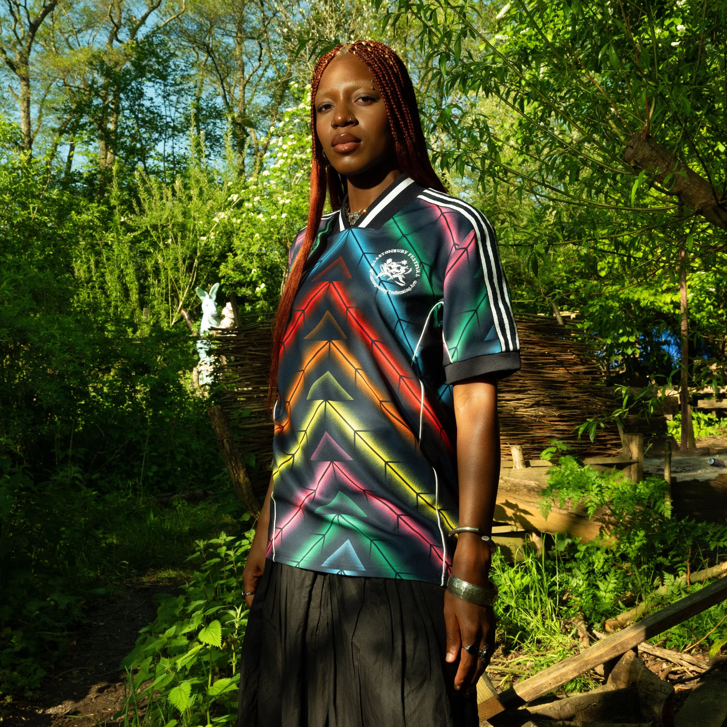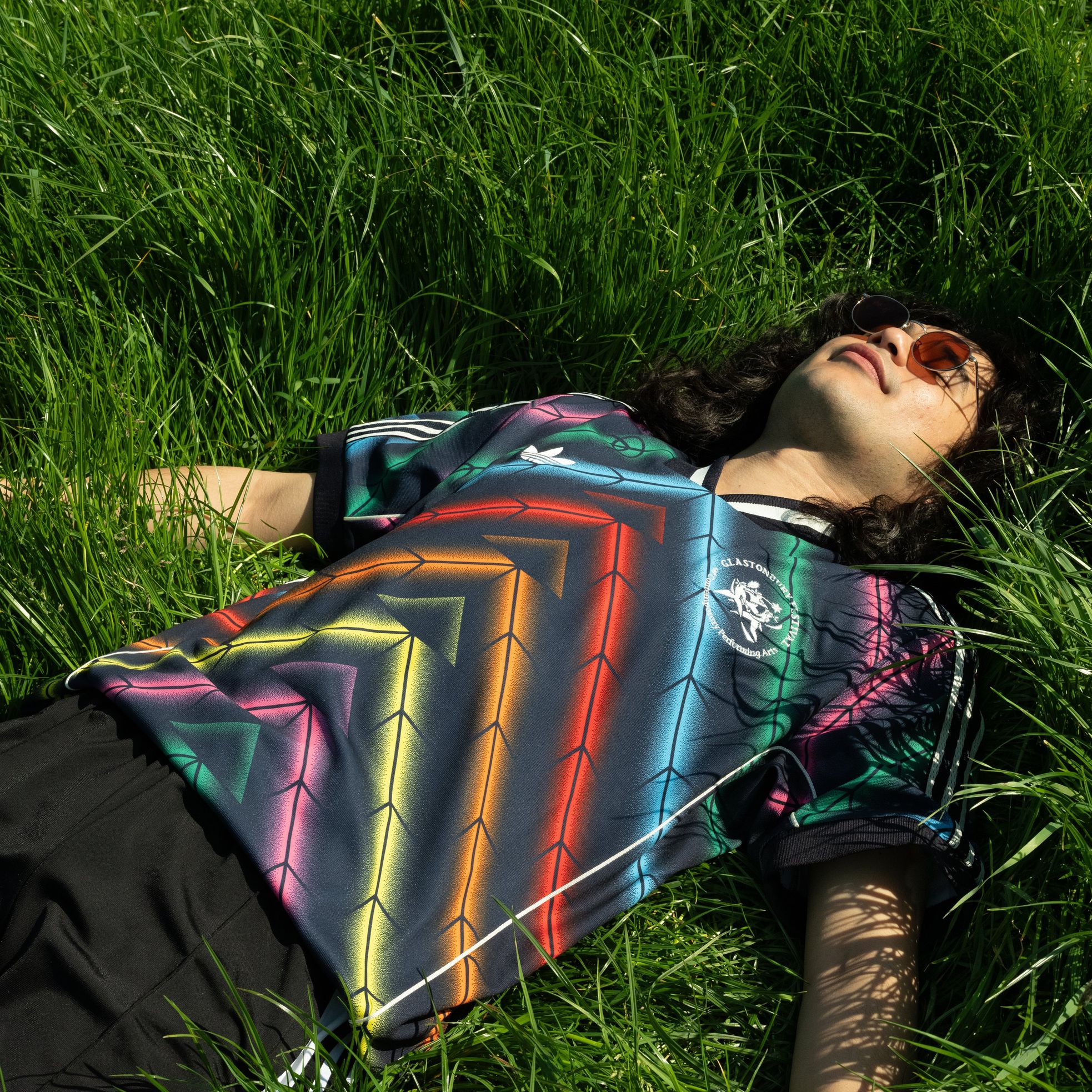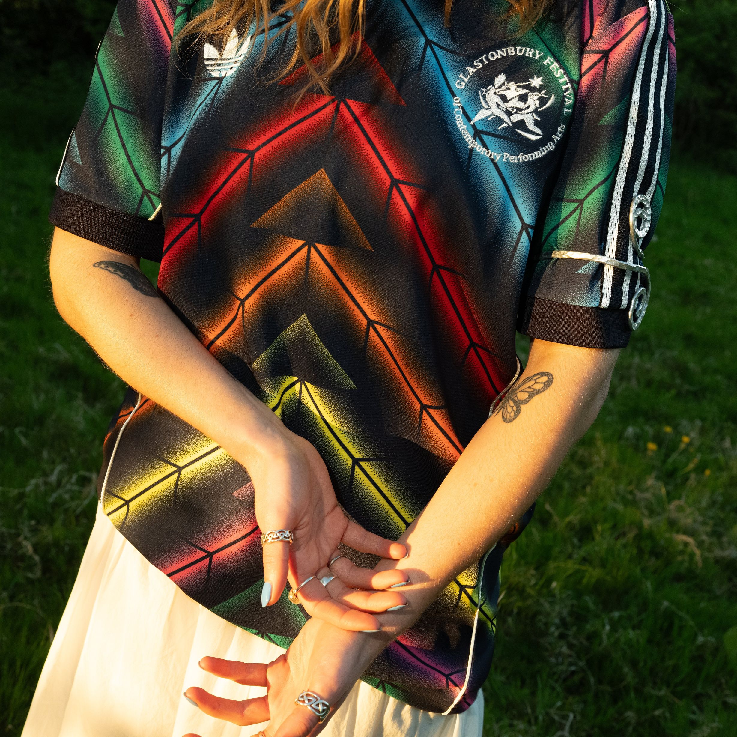 This version blends festival iconography into the design, incorporating bold multicolour arrow graphics across the shirt. The design references two of Glastonbury’s most recognisable landmarks, the Pyramid Stage and the Ribbon Tower, through the use of layered geometric patterns and vibrant colour gradients.