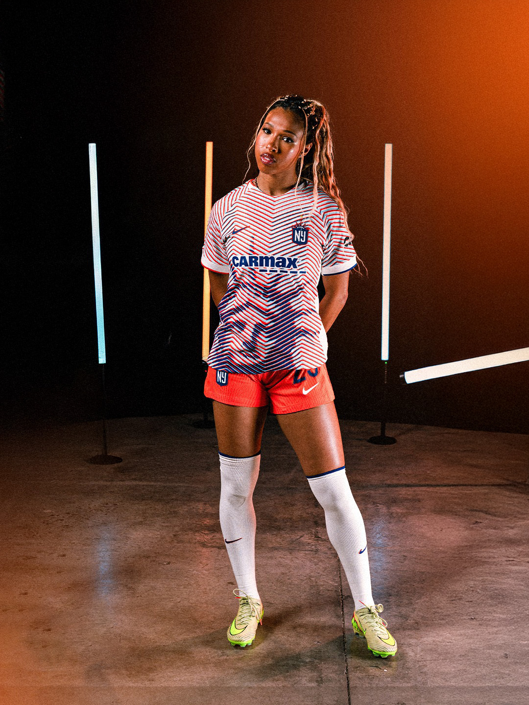 The new Gotham FC jersey is presented in white and features an all-over chevron graphic formed by fine diagonal lines in blue and orange. The pattern converges through the centre of the torso and incorporates a darker blue section that forms a stylised Lady Liberty head across the lower front panel. This visual effect runs from the shoulders to the hem, while the colour palette references the New York City flag.