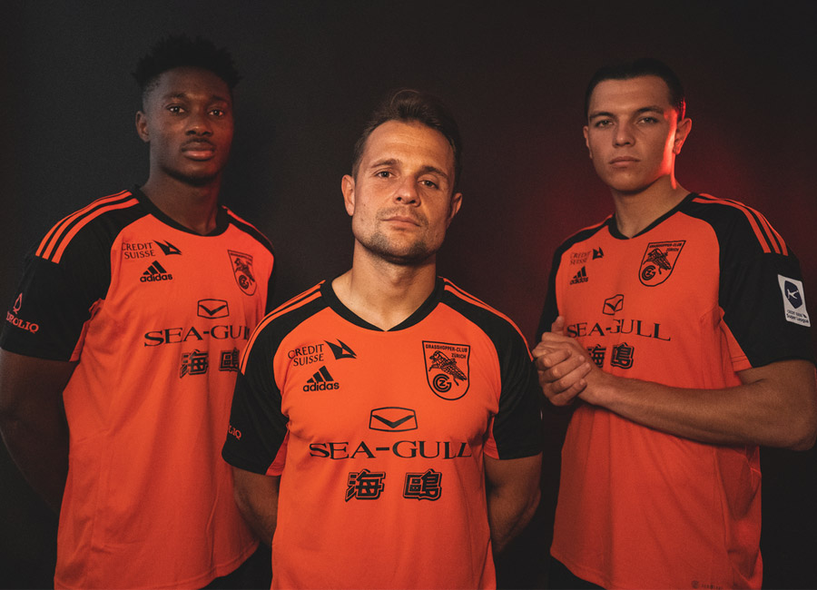 The shirt for Grasshoppers' weekend match against city rivals FC Zürich is in orange with black sleeves and largely black detailing.