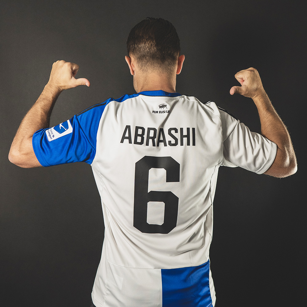 As the side panels and the lion’s share of the reverse are white, the shirt is more white than blue, and the upper back features a grasshopper detail with the legend "Für eusi Liebi" (For our Love). To complete the kit, the shorts and socks are in white with black and blue detailing.