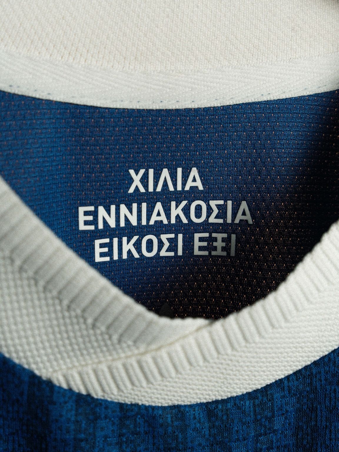 The new Greece jersey is presented in a deep blue (Dusky Petrol) base, complemented by subtle tonal vertical striping integrated into the fabric. A white collar is paired with matching adidas shoulder stripes, while the adidas Trefoil logo and the Hellenic Football Federation crest are applied on the chest. The crest features “ΕΛΛΑΣ” alongside the cross and striped shield. On the reverse, Greek text marking the federation’s founding year is positioned beneath the collar.