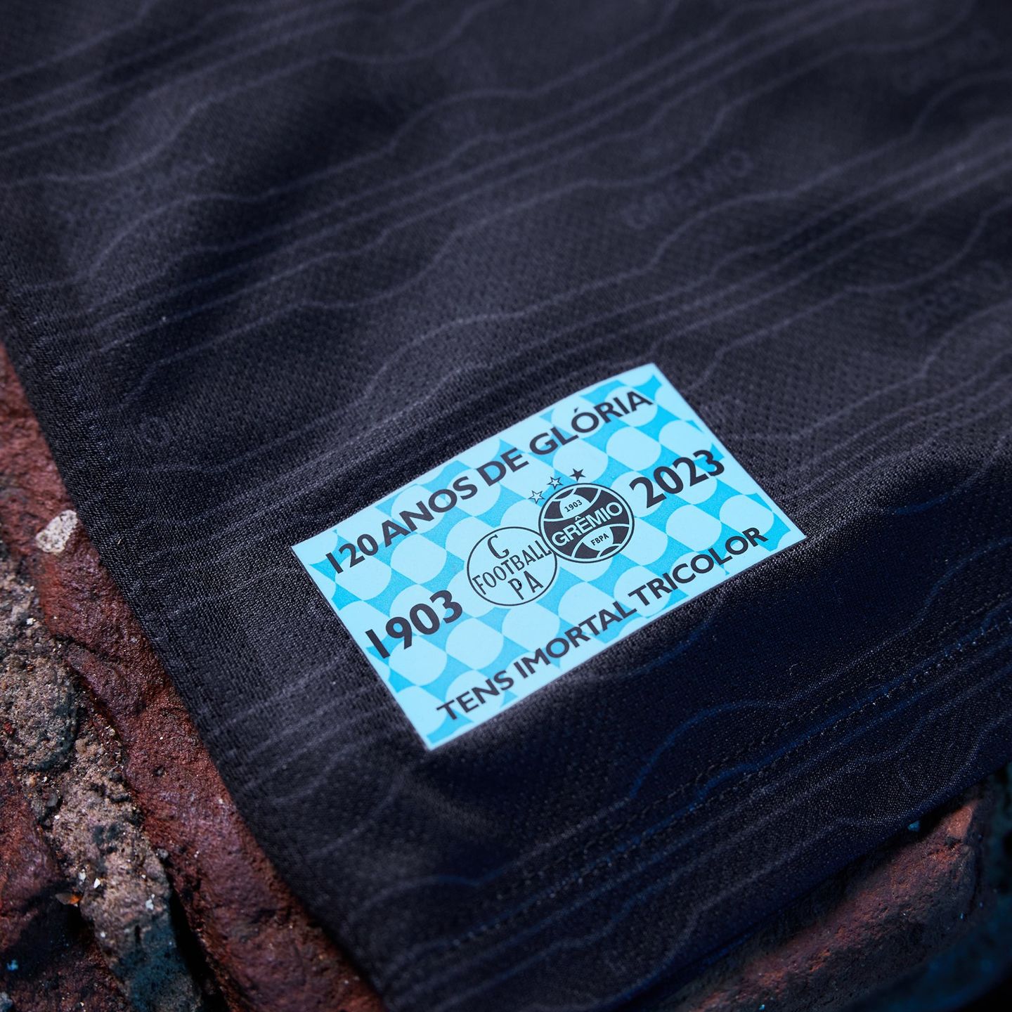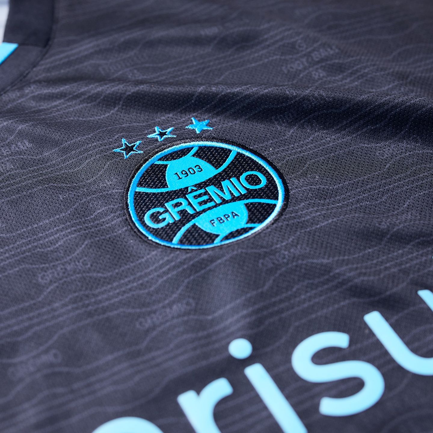The Third jersey features a sleek black design, evoking the nighttime skies of Porto Alegre. Across the front, a fluid graphic pattern merges with the interspersed word 'Grêmio.' The crewneck collar is accompanied by black and cyan shoulder and sleeve trims, adding to the stylish aesthetic.
